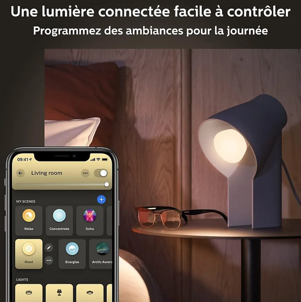 Intégrez facilement un éclairage connecté dans votre intérieur avec ces ampoules LED E27 Philips Hue, qui permettent un large panel de blancs, adaptés à chaque moment du quotidien. Compatible avec la plupart des luminaires, elle permet une variation d’intensité sans fil et instantanée pour créer l’ambiance parfaite à tout moment. Grâce à l’application Philips Hue Bluetooth, vous pouvez la contrôler facilement depuis votre smartphone et connecter jusqu’à 10 ampoules sans installation complexe. Pour aller plus loin, ajoutez le pont Hue (vendu séparément) et accédez à des fonctionnalités avancées comme le contrôle à distance, la création de routines personnalisées et la gestion d’un écosystème pouvant inclure jusqu’à 50 points lumineux. Contrôlez votre éclairage en toute simplicité via votre mobile, un accessoire Hue ou par commande vocale avec votre assistant connecté.