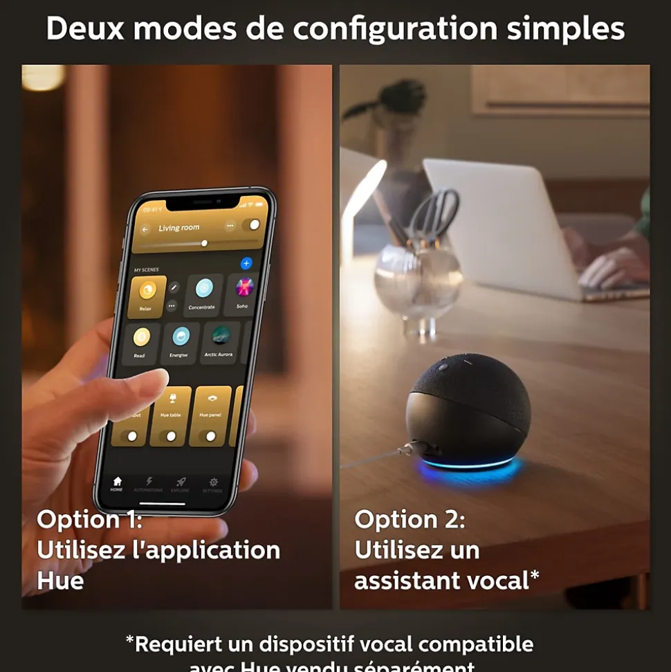 - Contrôle simple – Contrôlez depuis un accessoire Hue, votre mobile ou via votre assistant vocal.