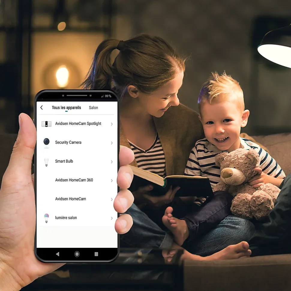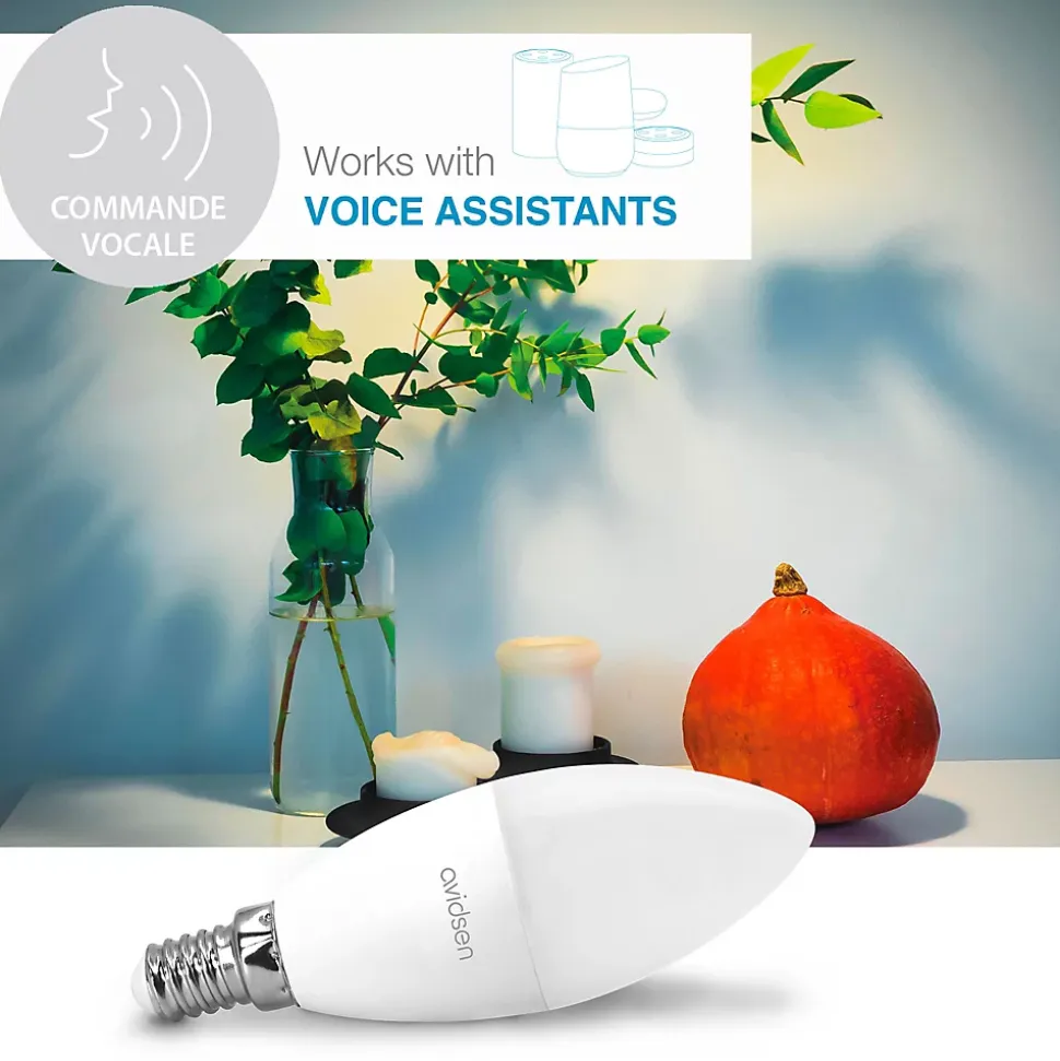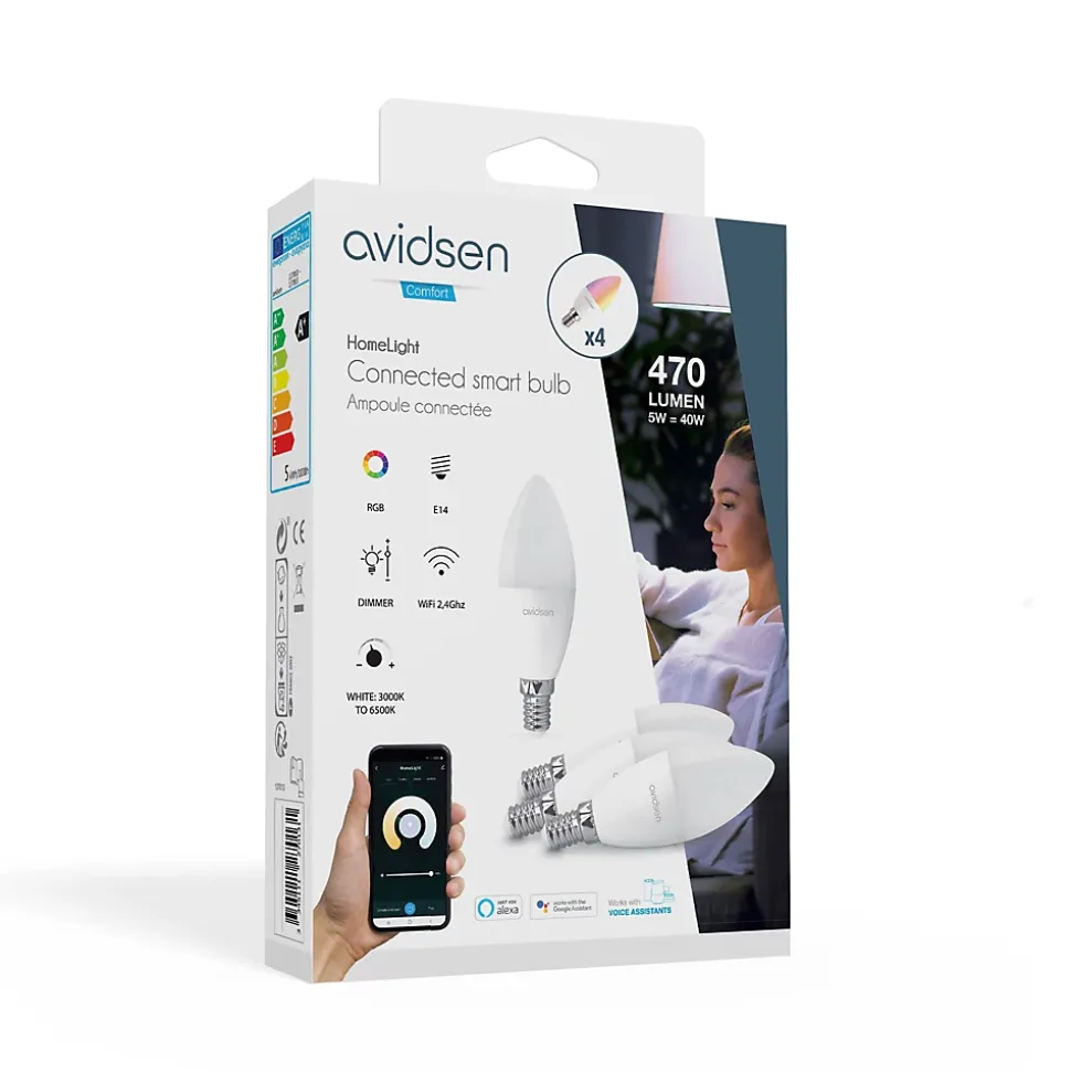 Des ampoules prévues pour vous rendre serviceFacilitez-vous la vie. Allumez et éteignez un luminaire difficilement accessible et gérez-le depuis votre téléphone. Comme le pack contient quatre ampoules, équipez une ou plusieurs chambres en mode « veilleuse » : réglez l’intensité, la couleur, depuis le salon. Les enfants sont rassurés. Confort et économies d’énergieAvec ces ampoules, vous variez l’intensité et la couleur. Votre confort est optimal, vous choisissez l’ambiance correspondant à vos besoins. Comme, à distance, vous pouvez éteindre une lampe restée allumée, vous économisez de l’électricité ; jamais une lampe ne reste en marche pour rien. Des ampoules ludiquesVariez agréablement la force de votre éclairage, entre luminosité intense et lumière tamisée. Choisissez la couleur délivrée par votre ampoule : blanc chaud, blanc froid, couleur de votre choix. Vous pouvez moduler ces ordres depuis votre smartphone ou votre commande vocale. Des ampoules inscrites dans votre projet d’habitat connectéComme de nombreux accessoires intelligents de la gamme Avidsen Home, nos ampoules connectées s’intègrent à vos scénarios d’habitat connecté. Simulez une présence chez vous, améliorez votre confort et faites des économies d’énergie. Associez-les à vos caméras, vos détecteurs de mouvement, vos prises connectées…Découvrez le contenu du kitLe kit comprend quatre ampoules connectées culot E14. Avec ce pack, démarrez votre expérience de lumière connectée. Équipez votre salon, la chambre de vos enfants par exemple : vous pourrez expérimenter la veilleuse connectée ou l’ambiance tamisée dans votre salon.