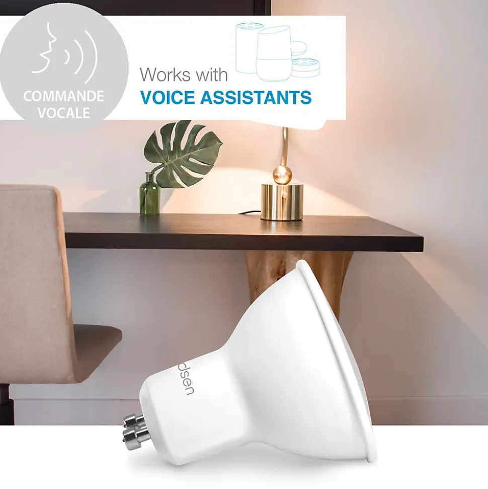 Différents modes d’allumage à votre dispositionLes ampoules Avidsen déploient plusieurs types d’éclairage. Pour un éclairage blanc, vous pouvez choisir un blanc chaud (jaune clair) ou un blanc froid (blanc très clair). Vous pouvez également allumer en couleur ! Enfin, ajustez le mode d’éclairage : votre ampoule peut produire un éclairage intense ou tamisé. Des ampoules ludiquesConnectée à votre smartphone, l’ampoule réagit aussi à la musique que vous écoutez depuis votre playlist. Vous revivez la prestation de votre groupe favori en concert ? Vous chantez en play-back en chœur avec la chanteuse que vous admirez le plus ? Profitez de l’instant, votre lumière se met à votre rythme.Compatibilité Avidsen Home et assistants vocauxAvec l’application Avidsen Home, pilotez les ampoules depuis votre application et commandez-les à la voix avec votre assistant vocal Google ou Alexa. Intégrez vos ampoules à votre écosystème Avidsen HomeConfort, sécurité et économies d’énergie : associées à d’autres produits de la gamme Avidsen Home, les ampoules connectées vous permettront de simuler une présence, rentrer chez vous le soir dans un logement lumineux, ou d’éteindre une lumière restée allumée pour rien.Découvrez le contenu du kit4 ampoules connectées Avidsen Home culot GU10Les ampoules connectées Avidsen Home, ici en pack de quatre et dotées d’un culot GU10, sont bien plus qu’un accessoire ludique. Compatibles avec l’application Avidsen Home et pilotables par smartphone et assistant vocal Google ou Alexa, elles améliorent vos routines de confort, de sécurité et vous permettent de réaliser
