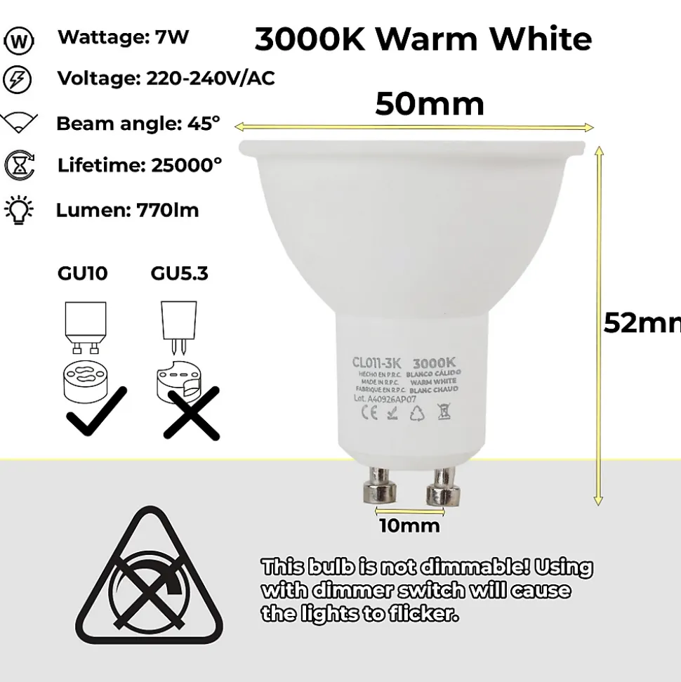 Bombillas LED GU10 7W Ø50mm, ángulo 45 La ampoule LED GU10 de 7W Ø50mm, avec un angle de 45 , est une excellente alternative aux ampoules halogènes, avec une connexion directe à 220V sans nécessité de transformateur supplémentaire. Non dimmable et facilement adaptable à différents anneaux ou spots. Elle offre des économies d’énergie significatives et est disponible dans plusieurs températures de couleur : 3000K pour des espaces confortables 4000K pour des zones de travail et de lecture 6000K pour des environnements de travail intensifs