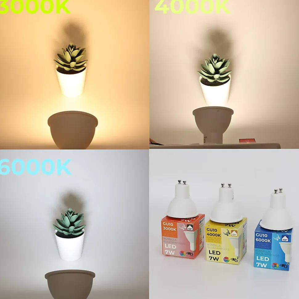Ampoules LED GU10 7W Ø50mm, angle 120 La lampe LED GU10 de 7W est une excellente alternative aux ampoules halogènes, avec une connexion directe à 220V sans besoin de transformateur supplémentaire. Non dimmable et facilement adaptable à différents supports ou spots. Elle permet des économies dénergie significatives et est disponible en plusieurs températures de couleur : 3000K pour des espaces chaleureux et confortables 4000K pour les zones de travail et de lecture 6000K pour les environnements de travail intensifs