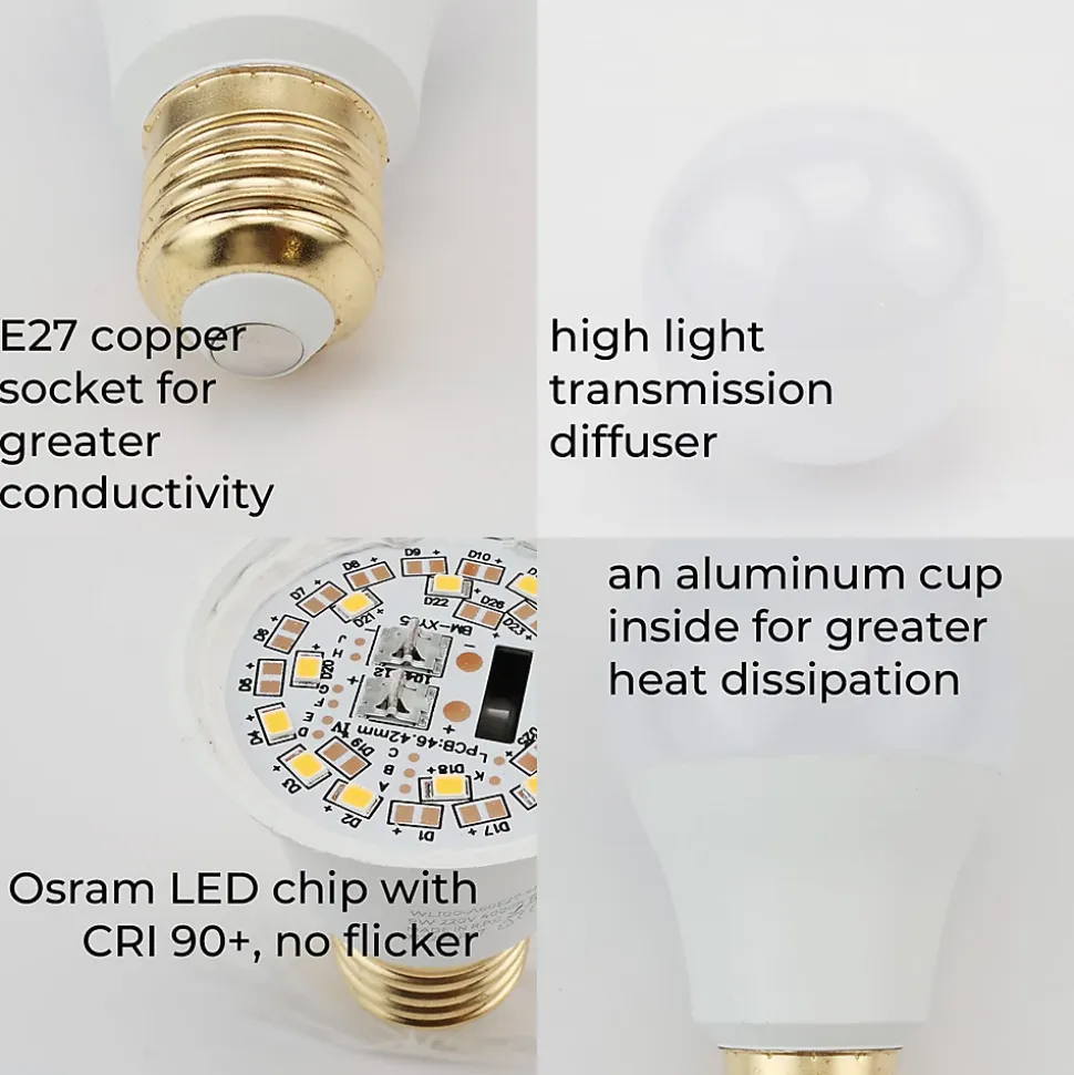 Ampoule LED standard E27 A60 de 9W, capable de remplacer les ampoules incandescentes jusqu’à 80W, permettant ainsi une économie d’énergie pouvant atteindre 85%. Équipée de puces LED OSRAM SMD2835 fournissant une lumière de haute qualité, avec un indice de rendu des couleurs (IRC) supérieur à 90. Disponible en 4 teintes : Blanc chaud : 3000K – 900 lm Blanc neutre : 4000K – 900 lm Blanc froid : 6000K – 900 lm Le prix net final exclut les remises supplémentaires ou les coupons. Avec un large angle d’ouverture de 230° et un IRC supérieur à 90, cette ampoule LED E27 A60 garantit une reproduction fidèle des couleurs, similaire à la lumière naturelle. Adaptée à diverses applications, telles que les lampes LED, sur pied, murales, de table, les lustres, etc. Elle offre des avantages significatifs par rapport aux ampoules incandescentes traditionnelles : économie d’énergie supérieure à 85%, durabilité accrue et option ne contenant ni métaux lourds ni émettant de rayonnements UV ou IR. Caractéristiques principales : Tension d’entrée : 220-240 V AC Puissance : 9W Lumens : Blanc chaud : 3000K – 900 lm Blanc neutre : 4000K – 900 lm Blanc froid : 6000K – 900 lm Angle d’ouverture du faisceau lumineux : 230° IP20 : adaptée à une utilisation en intérieur Durée de vie : environ 25 000 heures Dimensions : ø 60 x 110 mm.