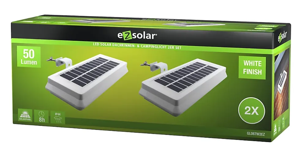Lumière solaire de gouttière LED Lot de 2 50 Lumen 2x 3 SMD Power LED Runtime : Jusqu’à 8 heures Matériau : Plastique, y compris le matériel d’installation pour le montage mural ou la suspension à la gouttière Fonctions : On/off