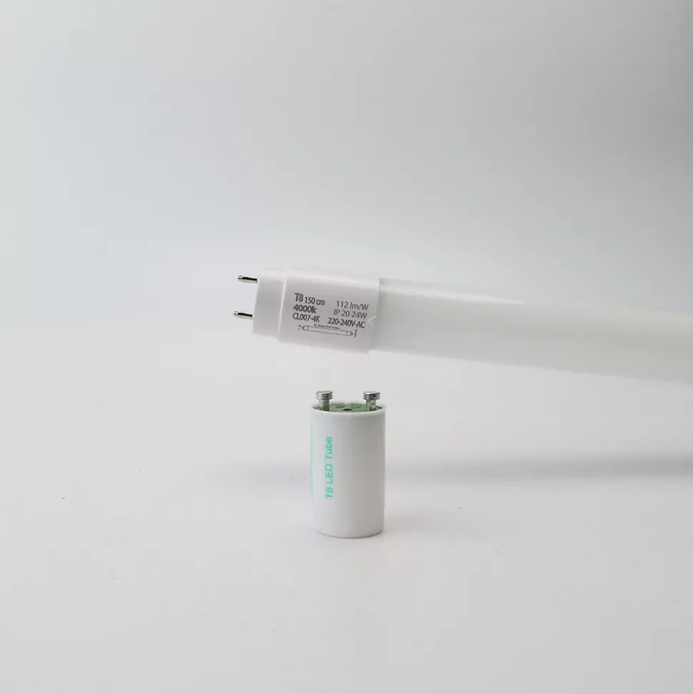 Tube LED T8 en verre 150cm 24W Caractéristiques principales : Puissance : 24W Efficacité : 112 LM/W Facteur de puissance : 0,95 Angle douverture : 330 Tension dentrée : 175V-265V Matériau : Verre et plastique haute transmission lumineuse Diamètre : Ø26mm Options de couleur : Blanc froid : 6000K, 2688 lm Blanc neutre : 4000K, 2688 lm Équivalences : 4000K (24W) = Fluorescent 58W/840 – 58W/845 6000K (24W) = Fluorescent 58W/860 – 58W/865 Installation : Ballasts ferromagnétiques : Éteindre la lumière et vérifier labsence de courant. Retirer lancien tube et le starter. Installer le pont starter LED. Retirer le condensateur. Installer le nouveau tube LED. Ballasts électroniques : Éteindre la lumière et vérifier labsence de courant. Retirer lancien tube. Déconnecter les câbles du ballast. Connecter les câbles directement au réseau électrique sur lun des supports de tubes. Signaler le support de lampe connecté. Applications : Éclairage général et remplacement des tubes fluorescents conventionnels. Idéal pour les parkings, bureaux, magasins, galeries commerciales, cuisines, etc. Parfait pour linstallation murale grâce à son large angle douverture. Inclus : Pont pour starter.