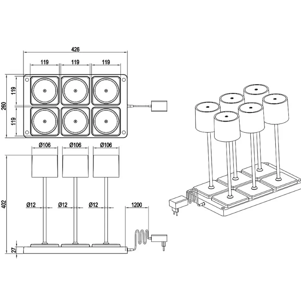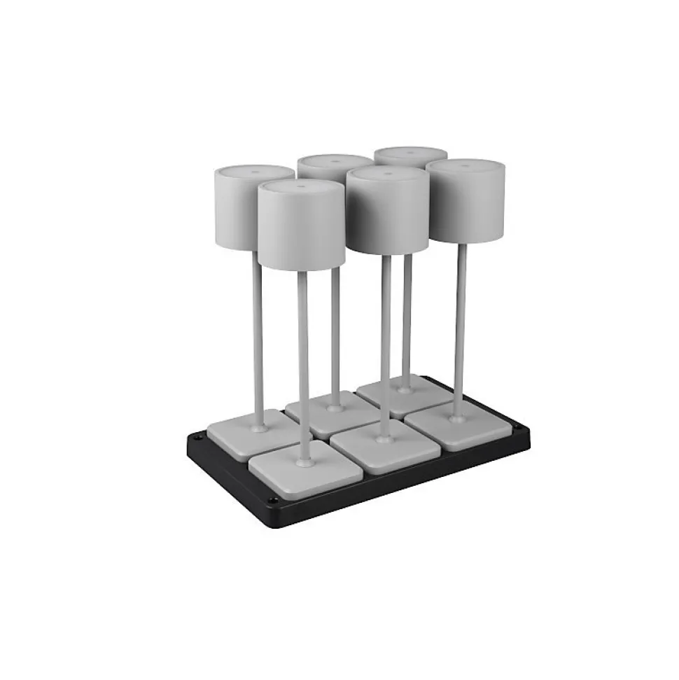 Les caractéristiques techniquesCe lot de 6 lampes de table Fernandez est en plastique et métal gris.Les lampes sont CCT en 3 étapes(2700+4000+6000K) et étanches (IP54).Elles sont également dimmables en continu.Elles se rechargent sur leur station et vous proposent une autonomie de 8 heures pour un temps de charge de 5 heures.Vous pouvez les utiliser en extérieur (IP54).Tout les réglages se font par bouton tactile.Les avantages esthétiquesCraquez pour le gris très contemporain des lampes de table Fernandez qui s’intégreront parfaitement dans tous types d’extérieurs grâce à leur design.Pratique, leur station de recharge vous permet d’avoir en permanence 6 lampes opérationnelles à portée de main.Dimmables en continu, elles vous permettent d’ajuster l’intensité lumineuse en fonction de l’ambiance souhaitée.Etanches, elles peuvent être utilisées à l’extérieur.Les lampes Fernandez permettent de répondre à vos besoins d’éclairage en l’absence d’alimentation électrique à proximité.En usage professionnel, ce produit est idéal pour la terrasse d’un restaurant car vous pourrez éclairer efficacement vos tables sans installation électrique coûteuse et charger 6 lampes en même temps.Le pack Fernandez existe en gris (ref R54096677) et en blanc (R54096631).