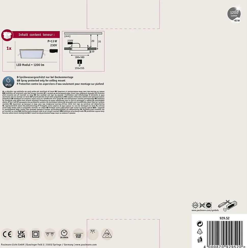 Kit complet comprenant panneau, câble de connexion et matériel de fixation|Cache en plastique satiné pour une diffusion subtile de la lumière|Faible profondeur d’encastrement de 35 mm seulement|Pour raccordement direct au secteur 230V|Ampoules LED intégrée également fournies|Température de couleur: 3000K – Blanc chaud
