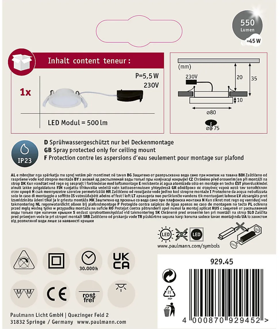 Kit complet comprenant panneau, câble de connexion et matériel de fixation|Cache en plastique satiné pour une diffusion subtile de la lumière|Faible profondeur d’encastrement de 35 mm seulement|Pour raccordement direct au secteur 230V|Ampoules LED intégrée également fournies|Température de couleur: 3000K – Blanc chaud
