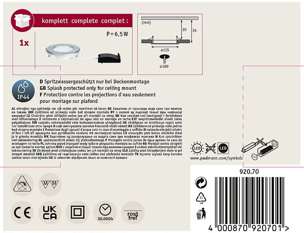 Luminaire individuel module LED inclus|La technologie LED fait économiser jusqu’à 80 % d’énergie par rapport aux ampoules à incandescence classiques.|Température de couleur: 4000K – Blanc neutre|Protection IP : IP44 – Protection contre les projections d’eau|Boîte raccord avec double clip de fixation rapide pour la connexion du câble incluse