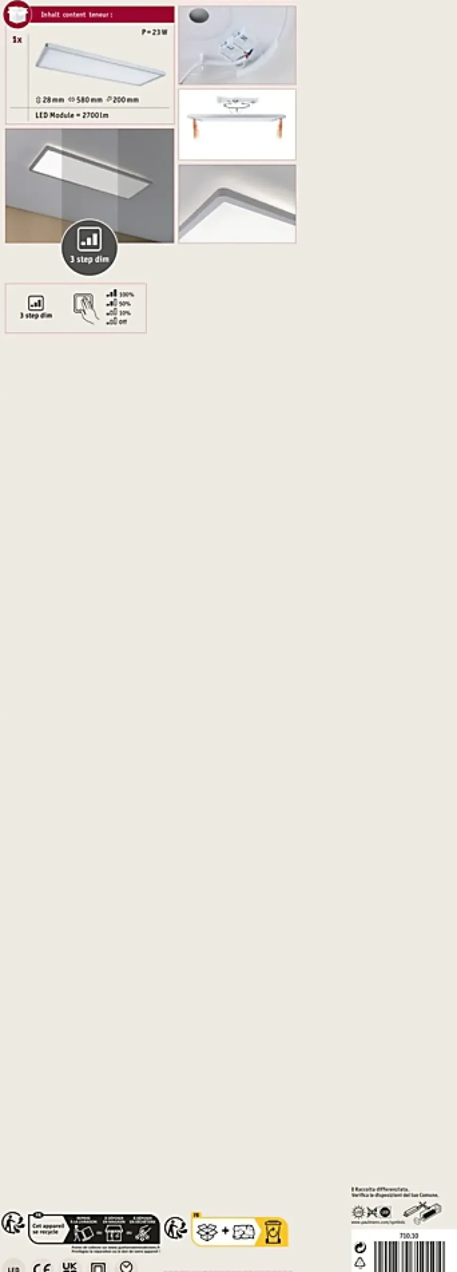 Avec une puissance de 22W, le panneau LED carrée Atria Shine de couleur Chrome mat et mesurant 580x200mm est idéal pour l’éclairage de base des salons, chambres ou cuisines. La lumière blanche et chaude du panneau permet d’éclairer la pièce de manière uniforme et étendue. Avec sa fonction intégrée gradable sur 3 niveaux, il offre trois intensités de lumière en actionnant plusieurs fois un simple commutateur traditionnel. La technologie Backlight supplémentaire crée une atmosphère de bien-être particulière et donne comme l’impression que l’éclairage du panneau flotte. Grâce aux clips de fixation rapides et à la fermeture à vis spéciale, le panneau, avec sa hauteur de montage ultraplate de 28 mm, est très facile à installer.