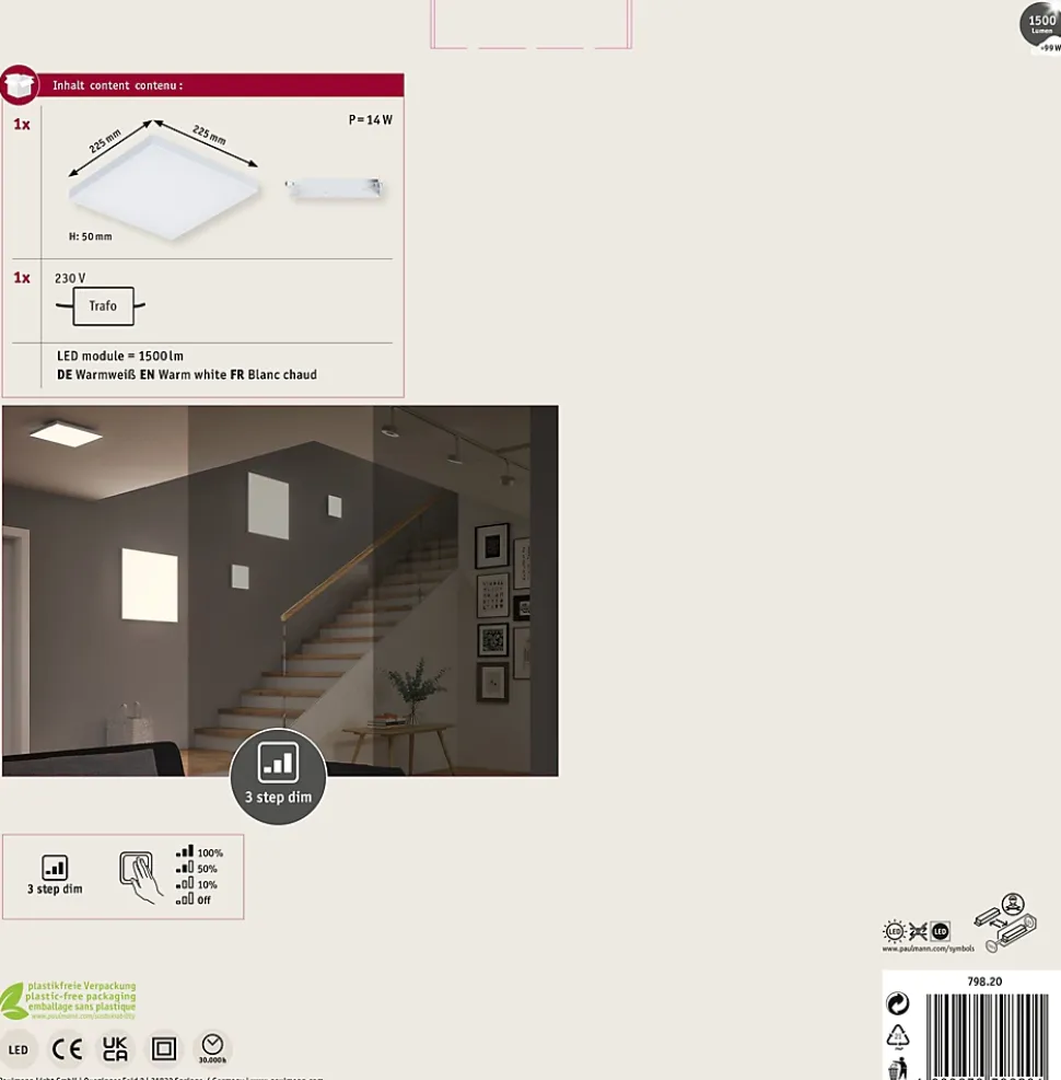 Température de couleur: 3000K – Blanc chaud|Éclairage de pièce uniforme sur la base de la technologie LED la plus récente|Design particulièrement plat|Avec ampoule LED intégrée|Un simple commutateur permet de faire varier la luminosité sur 3 niveaux|Pour raccordement direct au secteur 230V