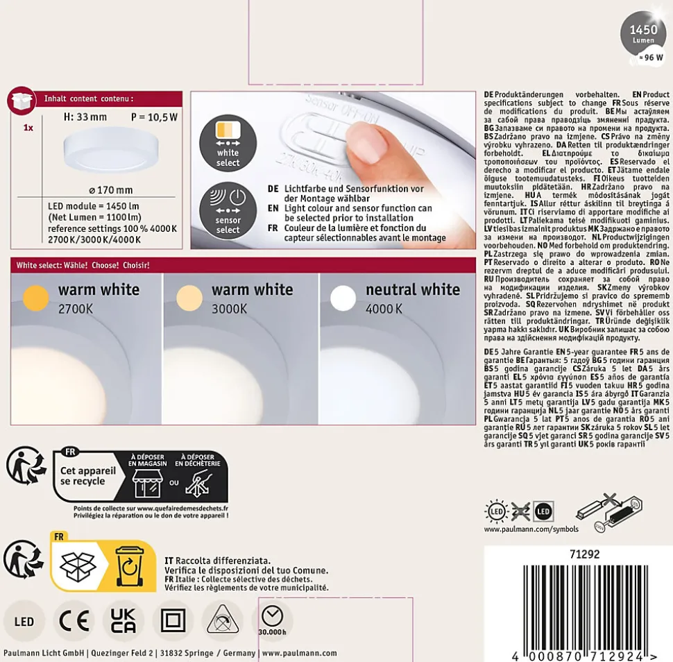 Fonction white select pour le choix individuel de la couleur de la lumière (2700 K, 3000 K, 4000 K) avant l’installation|Capteur de mouvement et crépusculaire intégré, activable via un interrupteur DIP|Lorsque le capteur est activé, la lumière ne s’allume qu’en cas de mouvement, pour une utilisation économe en énergie|Design sobre et intemporel s’adaptant à différents styles d’intérieur|Idéal pour la cuisine, le couloir ou les pièces fonctionnelles|Montage simple sans vis apparentes