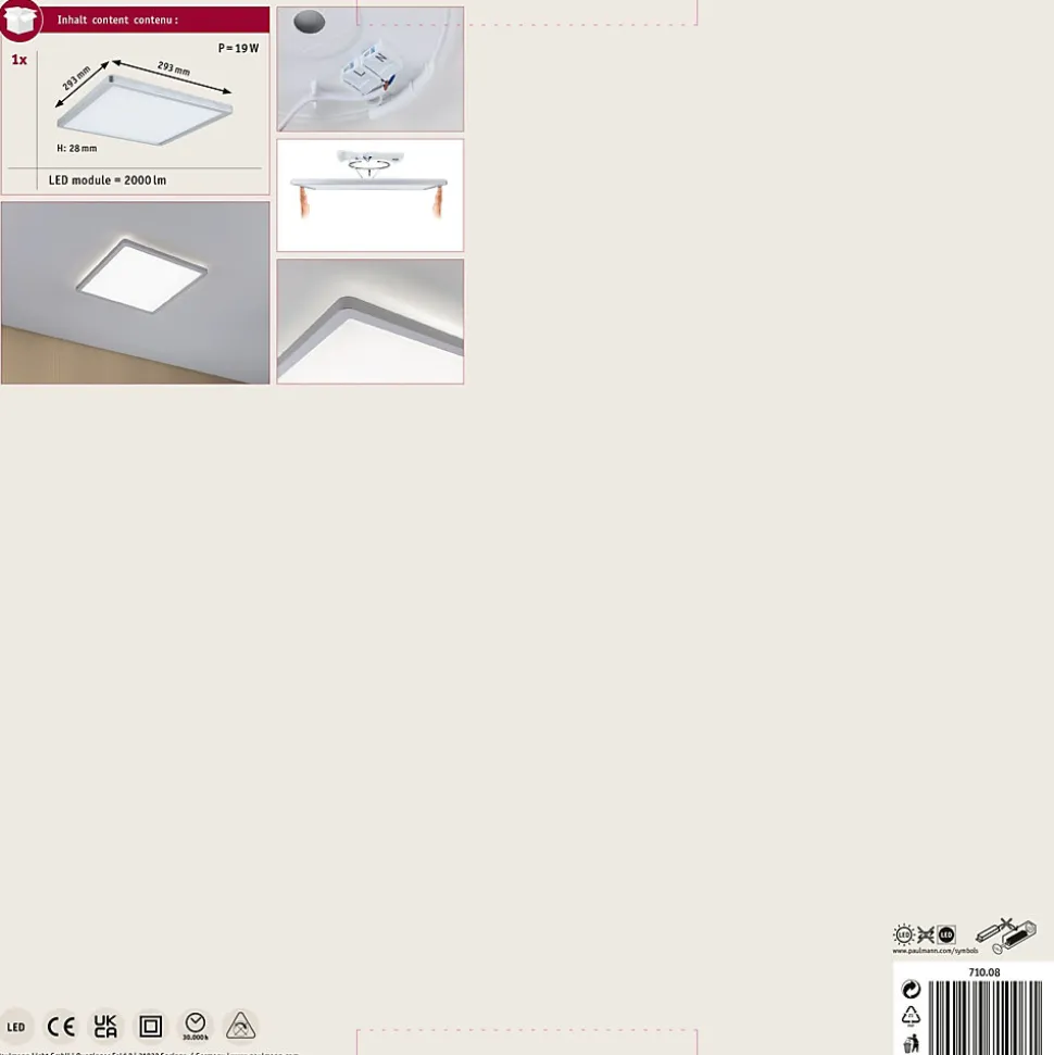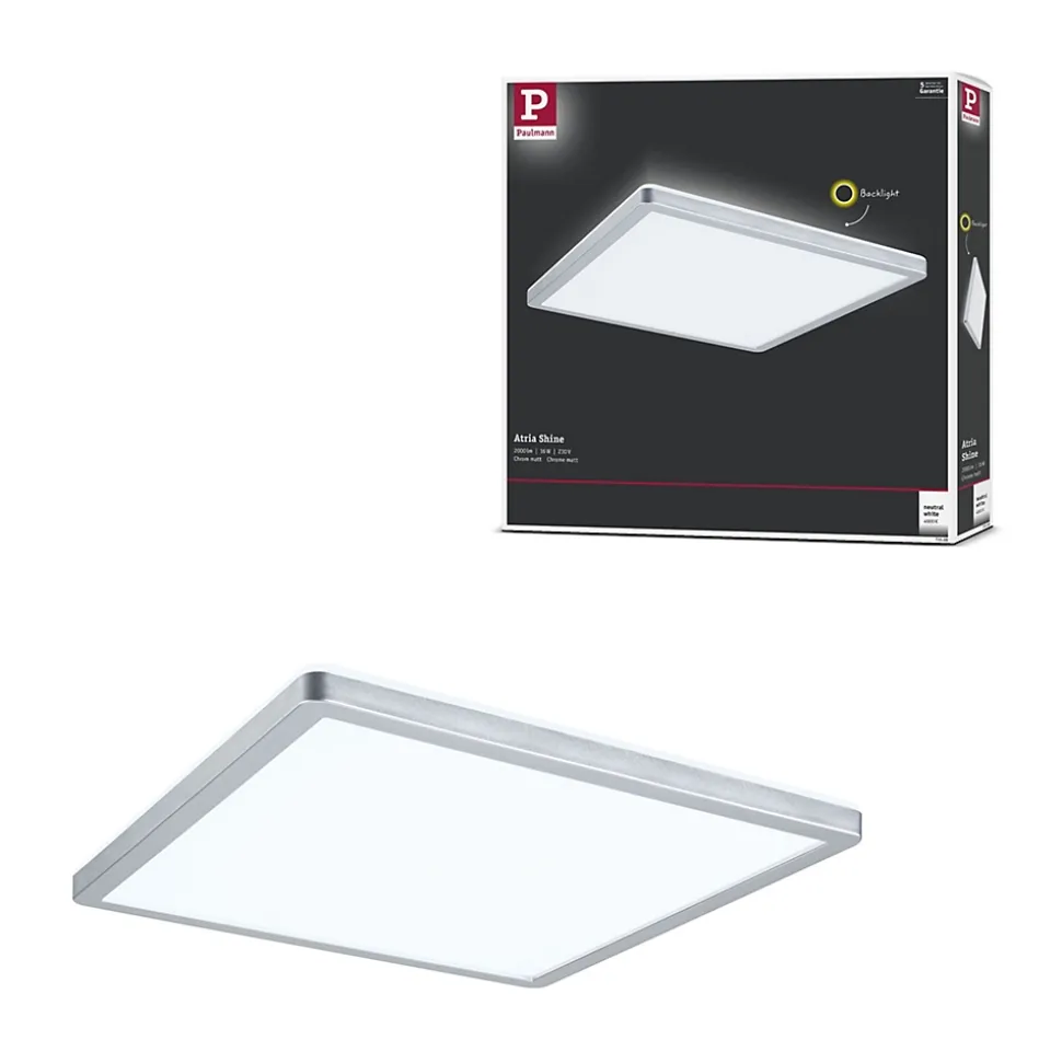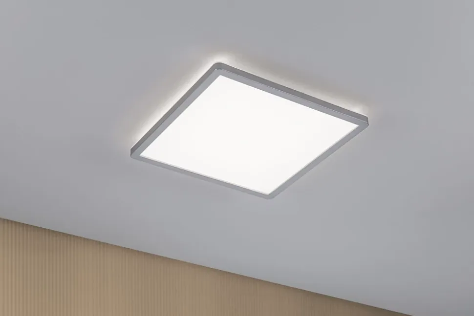 Avec une puissance de 16W, le panneau LED carrée Atria Shine de couleur Chrome mat et mesurant 293x293mm est idéal pour l’éclairage de base des salons, chambres ou cuisines. La lumière du panneau permet d’éclairer la pièce de manière uniforme et étendue. La technologie Backlight supplémentaire crée une atmosphère de bien-être particulière et donne comme l’impression que l’éclairage du panneau flotte. Grâce aux clips de fixation rapides et à la fermeture à vis spéciale, le panneau, avec sa hauteur de montage ultraplate de 28 mm, est très facile à installer.