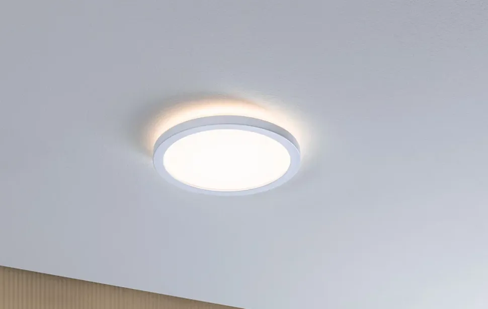 Protection contre les projections d’eau IP44, pour salle de bains|Technologie Backlight pour un aspect encore plus discret et presque flottant du luminaire|Design ultra-plat : Hauteur de montage de seulement 28 mm|Température de couleur: 3000K – Blanc chaud|Pose au mur ou au plafond|Éclairage de pièce uniforme sur la base de la technologie LED la plus récente|Design particulièrement plat
