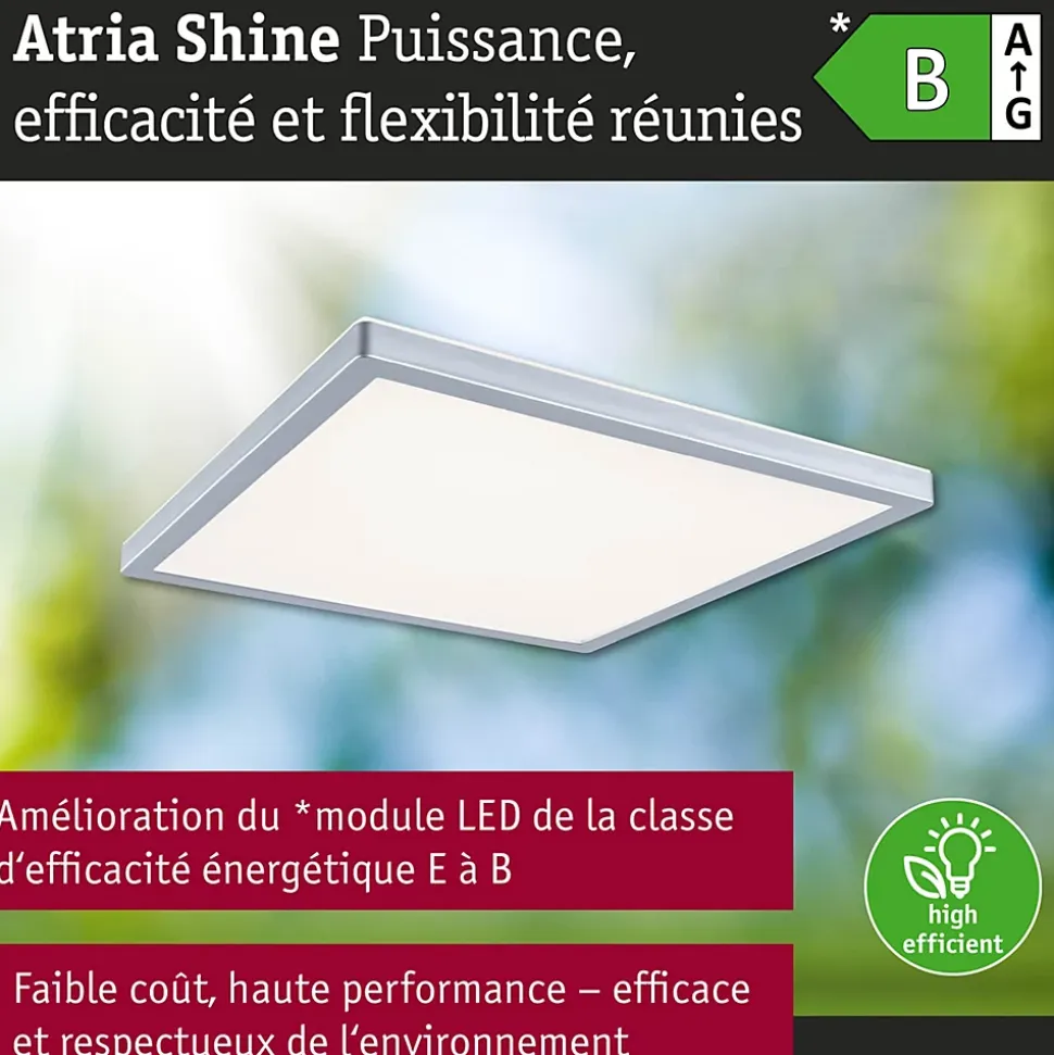 Le carrépanneau Atria Shine en Chrome mat est vraiment polyvalent grâce à sa grande performance énergétique et sa variété de couleurs de feu ! Avec sa performance énergétique améliorée, passée de la classe E à la classe B, le nouveau panneau Atria Shine offre une solution d’éclairage innovante et durable. Cette réduction significative de la consommation d’énergie est non seulement bénéfique pour l’environnement, mais aussi pour le porte-monnaie. Avant l’installation, l’interrupteur White Select permet de choisir entre trois températures de couleur : blanc chaud (3000 K), blanc neutre (4000 K) ou blanc lumière du jour (6500 K). Que ce soit pour un espace de vie confortable, l’éclairage fonctionnel d’une cuisine ou un bureau bien éclairé, il existe une atmosphère lumineuse adaptée à chaque pièce. Avec une luminosité impressionnante de 15,7W, le panneau Atria Shine est également idéal pour les applications exigeantes qui nécessitent beaucoup de lumière. L’aspect visuel du luminaire se distingue par son apparence presque flottante, obtenue grâce à la technologie Backlight efficace. Grâce à son design sobre, il s’intègre parfaitement dans différents styles d’aménagement et peut même être utilisé dans la salle de bains grâce à sa protection IP44. Le montage au mur ou au plafond est simple grâce à la fermeture rotative et au clip de fixation rapide.