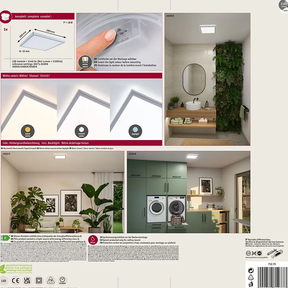 Panneau avec classe d’efficacité énergétique B (Module LED)|Fonction White Select pour un choix individuel de la température de couleur (3000 K, 4000 K, 6500 K)|Idéal pour un éclairage particulièrement lumineux|Protection IP44 contre les projections d’eau pour les salles de bains et autres pièces similaires|Aspect flottant grâce à la technologie Backlight|Pose au mur ou au plafond|Design plat : Hauteur de montage de seulement 35 mm|Montage facile grâce à la fermeture rotative et au clip de fixation rapide