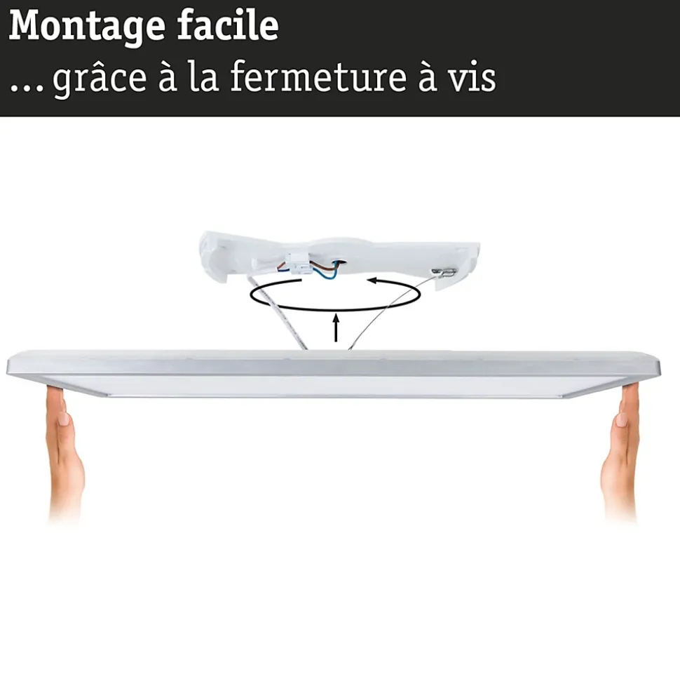 Panneau avec classe d’efficacité énergétique B (Module LED)|Fonction White Select pour un choix individuel de la température de couleur (3000 K, 4000 K, 6500 K)|Idéal pour un éclairage particulièrement lumineux|Protection IP44 contre les projections d’eau pour les salles de bains et autres pièces similaires|Aspect flottant grâce à la technologie Backlight|Pose au mur ou au plafond|Design plat : Hauteur de montage de seulement 35 mm|Montage facile grâce à la fermeture rotative et au clip de fixation rapide