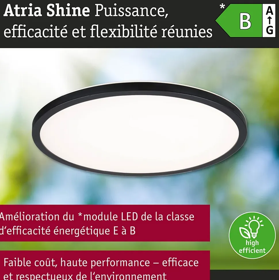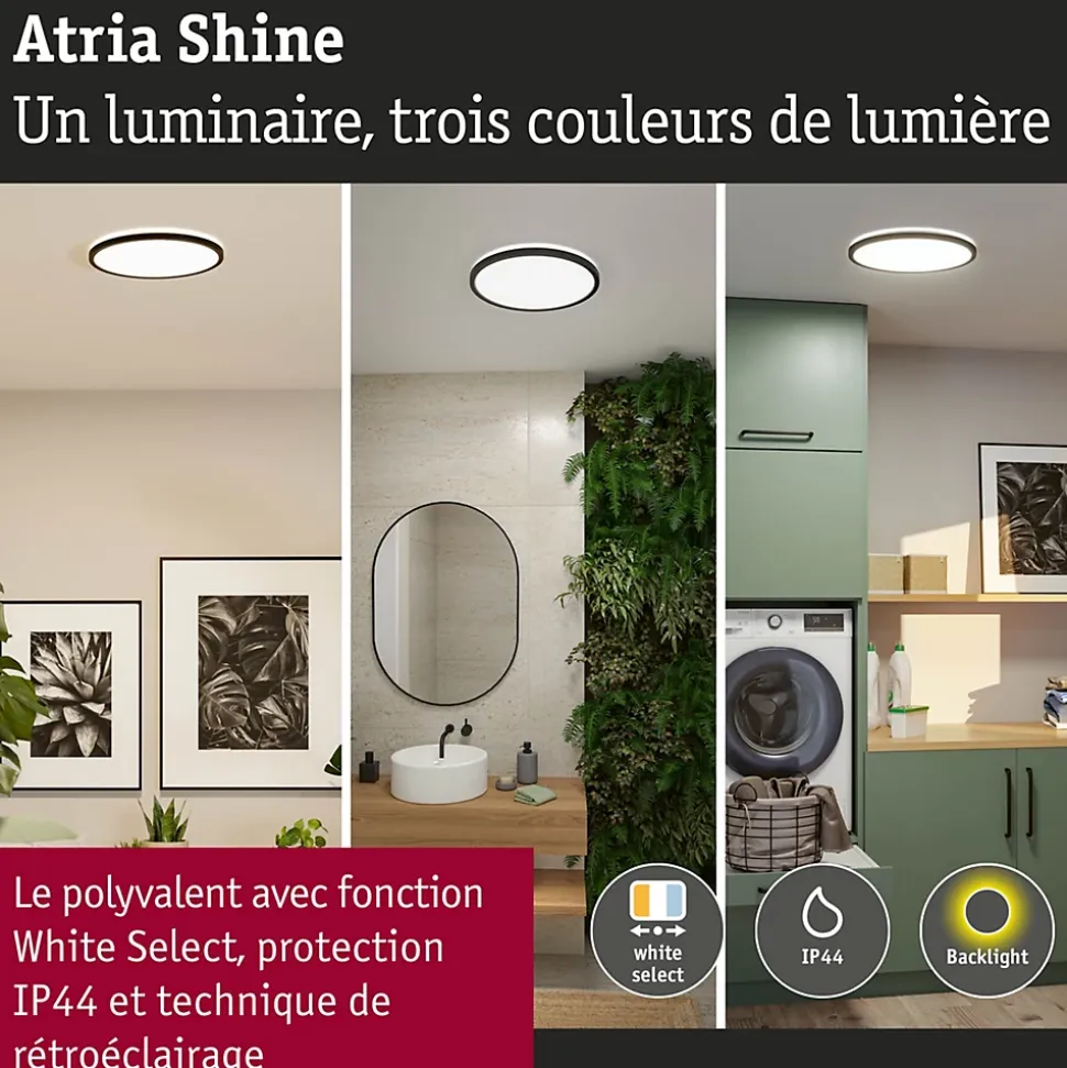 Le rond Atria Shine Panel Noir est très polyvalent grâce à ses performances énergétiques et à la diversité de ses options d’éclairage ! Par rapport au modèle précédent, le panneau consomme nettement moins d’énergie, ce qui a permis d’améliorer la classe d’efficacité énergétique de E à B. Cette réduction significative de la consommation d’énergie est non seulement bénéfique pour l’environnement, mais aussi pour le porte-monnaie. Avant l’installation, l’interrupteur White Select permet de choisir entre trois températures de couleur : blanc chaud (3000 K), blanc neutre (4000 K) ou blanc lumière du jour (6500 K). Que ce soit pour un espace de vie confortable, l’éclairage fonctionnel d’une cuisine ou un bureau bien éclairé, il existe une atmosphère lumineuse adaptée à chaque pièce. Avec une intensité lumineuse impressionnante allant jusqu’à 20,8W, le Atria Shine Panel est également idéal pour les applications qui nécessitent beaucoup de lumière. L’aspect visuel du luminaire se distingue par son apparence presque flottante, obtenue grâce à la technologie décorative Backlight. Grâce à son design sobre, il s’intègre parfaitement dans différents styles d’aménagement et peut même être utilisé dans la salle de bains grâce à sa protection IP44. Le montage au mur ou au plafond est simple grâce à la fermeture rotative et au clip de fixation rapide.