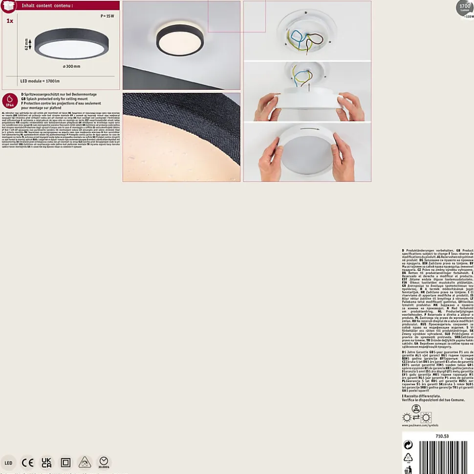 Protection contre les projections d’eau IP44, pour salle de bains|Éclairage de pièce uniforme sur la base de la technologie LED la plus récente|Température de couleur: 3000K – Blanc chaud|Pose au mur ou au plafond