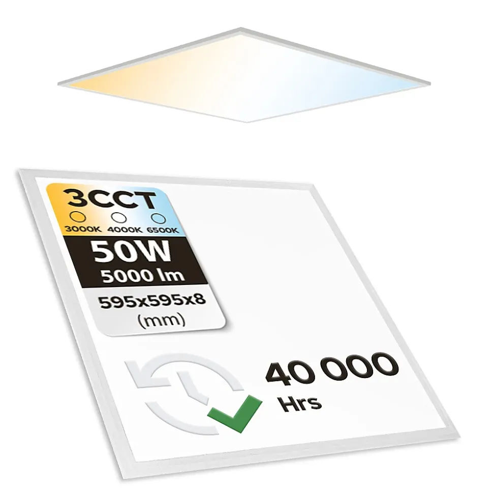 - Technologie LED EDGE SLIM (edgelit) moderne-Assure une diffusion homogène de la lumière sur toute la surface du panneau ainsi qu’une haute performance lumineuse de 5000 lumens pour une puissance de 50 W.