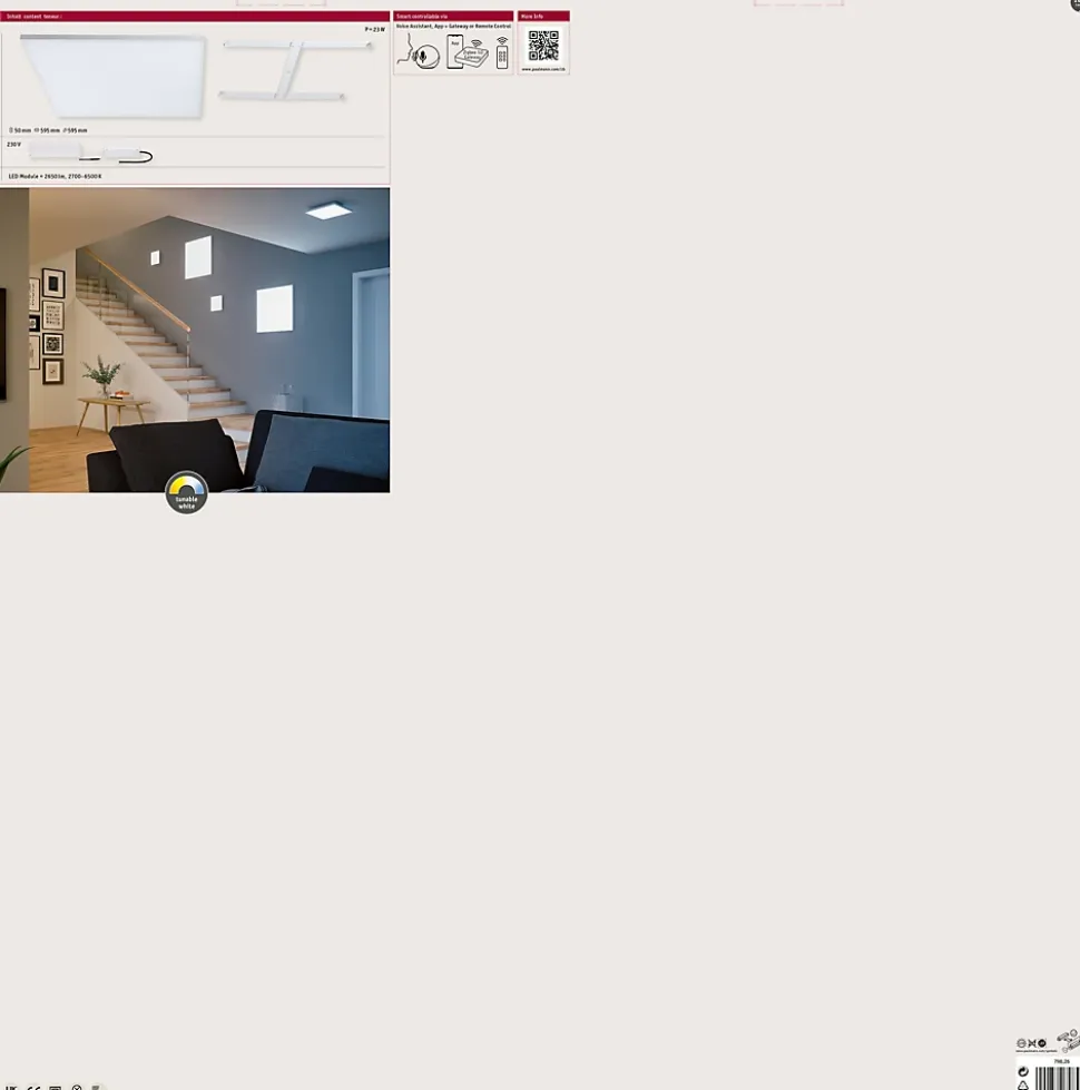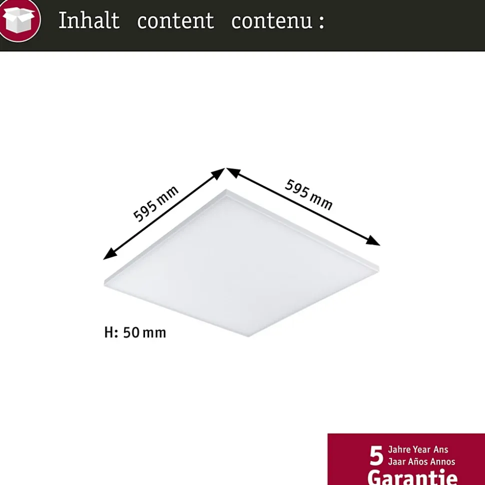 Le panneau Velora Zigbee 3.0 sans cadre, aux dimensions 595x595mm, offre un design extrêmement lisse et donc épuré. La surface satinée du diffuseur produit un agréable éclairage d’ambiance étendu. La fonction Tunable White permet de varier la température de couleur à votre guise : du blanc lumière du jour pour le travail au blanc chaud idéal pour la relaxation. Le luminaire est compatible Zigbee 3.0 3.0. ZigBee est un protocole de transmission radio qui met en réseau les appareils de différents fabricants. Le support métallique stable facilite le montage et donne l’impression que le panneau flotte en apesanteur.