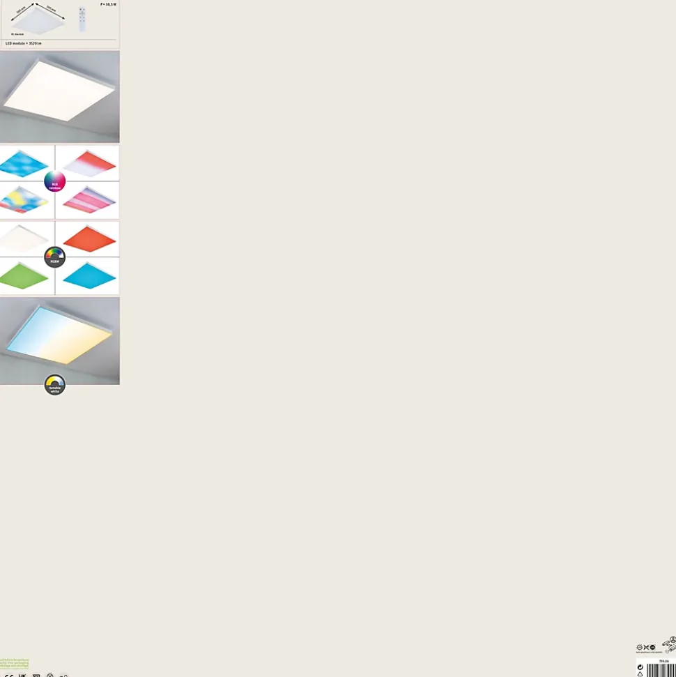 Pour des effets lumineux spectaculaires dans le salon – Le panneau LED Velora Rainbow de couleur Blanc et de dimensions 595x595mm, allie un excellent éclairage de la pièce à la pure magie des couleurs, car ici, les meilleures caractéristiques d’éclairage se trouvent combinées à des effets de couleur dynamiques. La température de couleur est réglable en continu par télécommande, de 3000 K blanc chaud à 6500 K blanc lumière du jour, ce qui est propice au biorythme naturel. Le panneau LED vous séduira aussi avec ses 16 animations prédéfinies et son contrôle dynamique des couleurs, qui ne sont possibles qu’avec un éclairage étendu. La vitesse de chaque scénario d’éclairage peut être adaptée ou figée comme un plan fixe. Cela permet de créer un éclairage étendu unique et individuel. Le panneau LED Velora Rainbow est réglable en continu et dispose d’une fonction veilleuse intégrée. Le panneau se distingue par sa surface lumineuse dépolie de haute qualité et par son design élégant dépourvu de bord. La pose au mur ou au plafond se fait au moyen d’un cadre flottant.