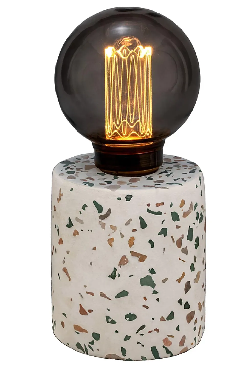 Avec son ampoule à l’air libre, la lampe à poser Elegant Flare habille de ses touches de lumières fascinantes les séjours ou les chambres à coucher. Très polyvalent, ce luminaire mobile sans câble trouve place sur la table à manger ou se transforme en accroche-regard sur les étagères et les commodes tout en créant une ambiance lumineuse chaleureuse. Son pied de lampe en Terrazzo tendance au motif individuel en font une pièce particulièrement unique. La lampe de table s’éteint automatiquement grâce à une minuterie de 6 heures.