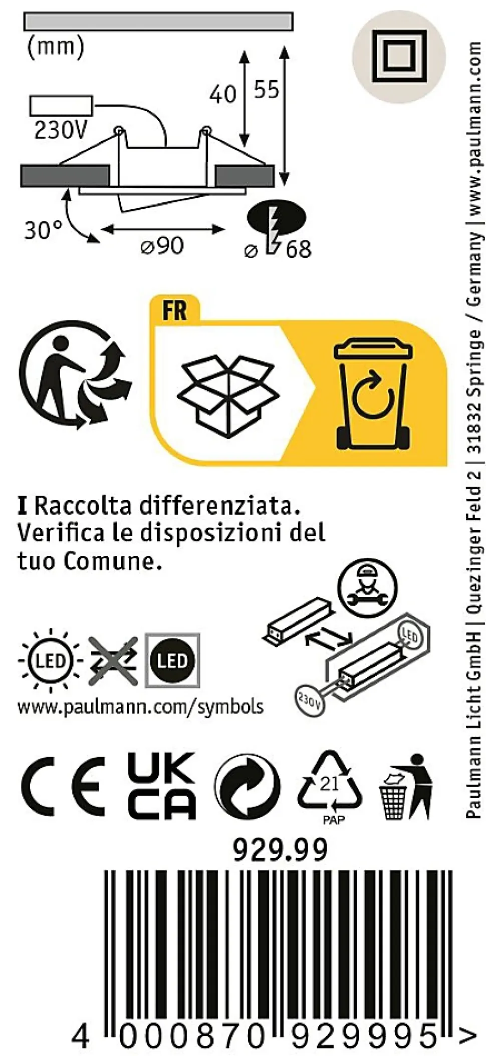 - Montage facile avec diamètre de découpe Ø 68 mm, diamètre extérieur Ø 90 mm, hauteur 50 mm.