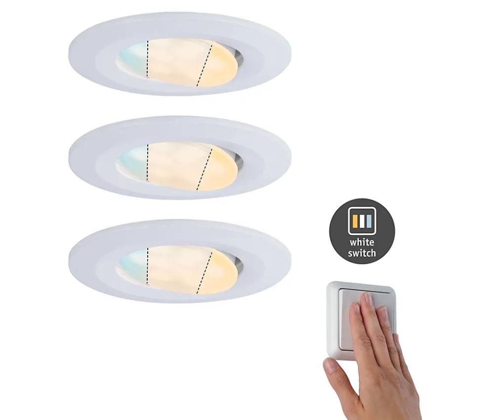 Il est compact, personnalisable et extrêmement lumineux. Le spot encastré LED Calla polyvalent en kit de 3 convient particulièrement dans les pièces humides. Pourvu de la protection contre les projections d’eau IP65, il ne craint pas l’humidité. Sa forme discrète s’intègre dans tous les styles d’intérieurs. Grâce à la fonction WhiteSwitch, la température de couleur peut être réglée de manière individuelle via l’interrupteur mural en fonction de l’heure de la journée et selon vos besoins : Blanc lumière du jour – Réveillez-vous ! Blanc neutre – Maquillez-vous ! Blanc chaud – Détendez-vous ! Avec les spots encastrés LED Calla, votre salle de bain bénéficie toujours de l’éclairage adéquat. La température de couleur peut s’adapter au biorythme par réglage à l’aide de l’interrupteur mural. La fonction mémoire intégrée enregistre les températures de couleur sélectionnées pour vos usages futurs. Orientables, les spots diffusent la lumière précisément là où vous le souhaitez.