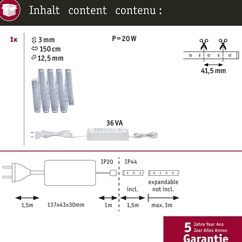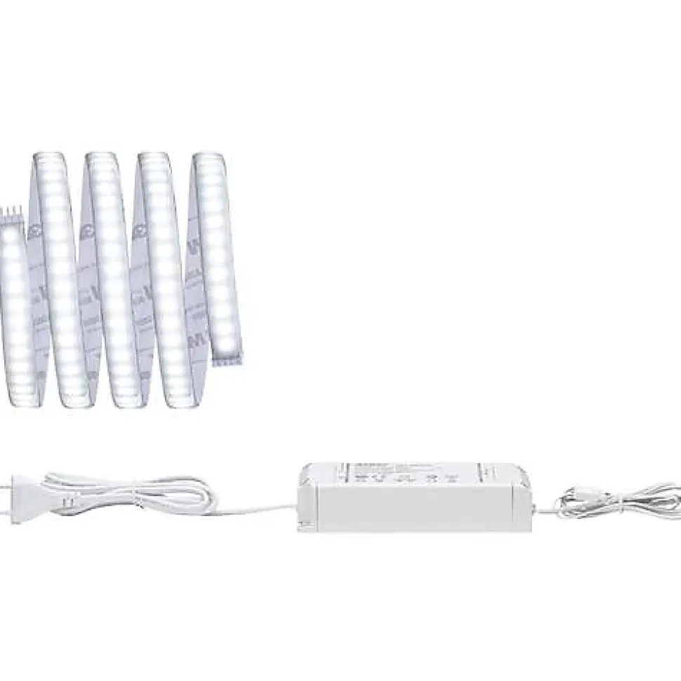 Ruban à LED Paulmann MaxLED 70671, 24 V, longueur 150 cm (1,5 m) – blanc lumière du jour 6500 K, flux lumineux total 1650 lm, puissance 17 W, 110 lm/m. Kit de base comprenant bande LED, bloc d’alimentation et notice d’utilisation. Bande autocollante, flexible et découpable, conçue pour une installation facile dans des profilés ou sur surfaces planes. Dimmable et raccordable pour extension jusqu’à la longueur maximale indiquée, ne pas dépasser la longueur recommandée. Convient pour l’intérieur et peut être utilisé en zones humides grâce à sa gaine de protection contre projections d’eau et poussière. Connexion via connecteur mâle 24 V, classe de protection II. Remarque : non compatible avec les rubans YourLED et MaxLED d’autres familles, respecter les spécifications de longueur et tension pour garantir le bon fonctionnement.