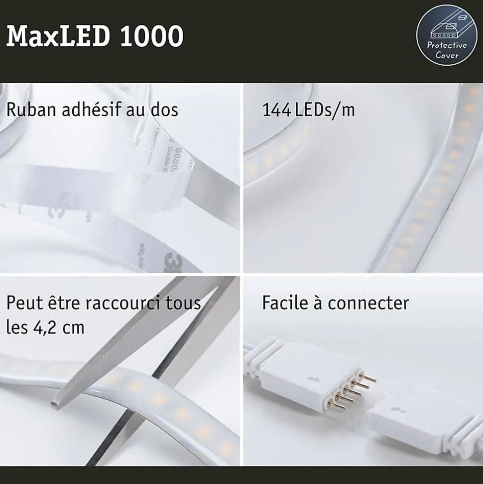Ruban LED Paulmann MaxLED prêt à poser, dimmable et extensible, offrant une lumière blanc chaud confortable et un flux lumineux de 1650 lm pour un éclairage d’ambiance ou fonctionnel dans les pièces intérieures.