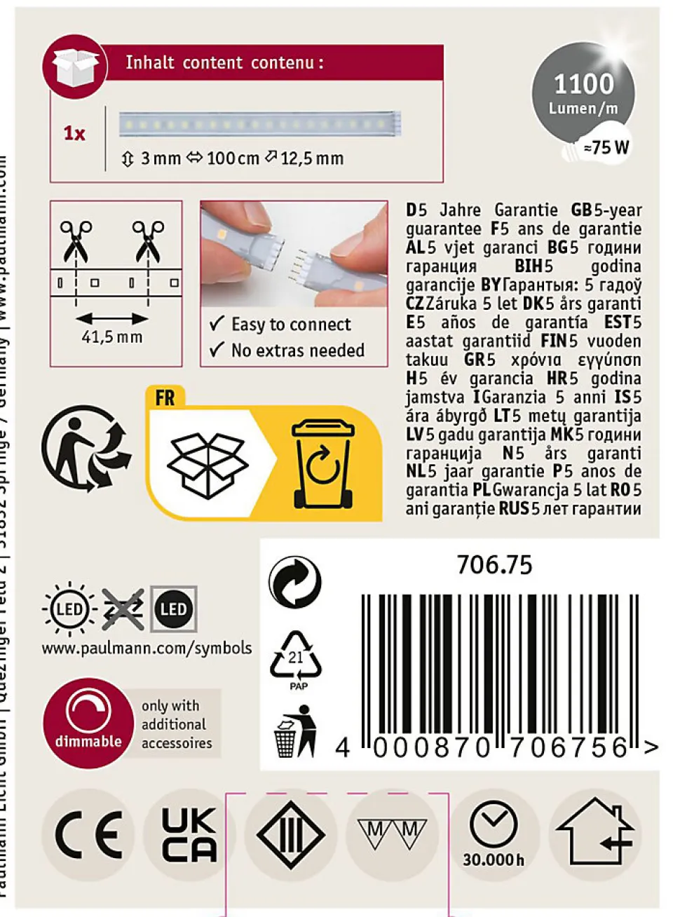 Ruban à LED d’extension Paulmann MaxLED 1000 70675, 100 cm, 24 V, blanc lumière du jour 6500 K. Flux lumineux total 1100 lm, puissance 11,5 W, rendement lumineux 95,65 lm/W. Bande flexible, découpable et autocollante, conçue pour être montée dans des profilés. Classe de protection III, couleur argent, matériau plastique. Fourni avec notice d’utilisation et connecteur mâle. Revêtement de protection contre projections d’eau et poussière, utilisable dans des pièces humides avec gaine thermorétractable. Ne pas dépasser la longueur maximale indiquée sur le kit de base.