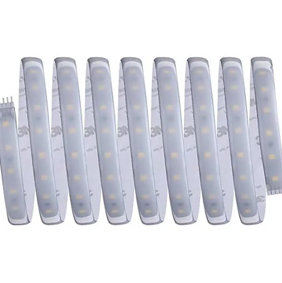 Ruban à LED Paulmann MaxLED 500 modèle 70666, longueur 3 m, blanc chaud 2700 K, puissance 20 W et flux total 1650 lm. Fonction dimmable, tension d’alimentation 24 V, connexion par connecteur mâle. Bande flexible, autocollante et découpable, adaptée aux profilés et à l’éclairage d’intérieur. Kit de base livré avec bloc d’alimentation et notice, extensible jusqu’à 6,2 m à l’aide de bandes et raccords supplémentaires. Équipé d’un revêtement de protection contre les projections d’eau et la poussière, utilisable dans les pièces humides avec gaine thermorétractable. Classe de protection II, matériau plastique, finition transparente brillante.