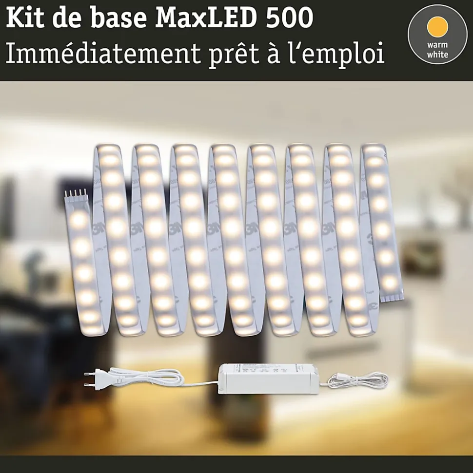 Ruban LED Paulmann MaxLED 500 – solution modulable et performante pour un éclairage intérieur chaleureux. Kit de base de 3 m, dimmable, autocollant et découpable, il s’installe facilement dans les profilés ou en éclairage d’appoint. Extensible jusqu’à 6,2 m et livré avec bloc d’alimentation, il combine flexibilité, sécurité et rendu lumineux de 1650 lumens pour une ambiance soignée.