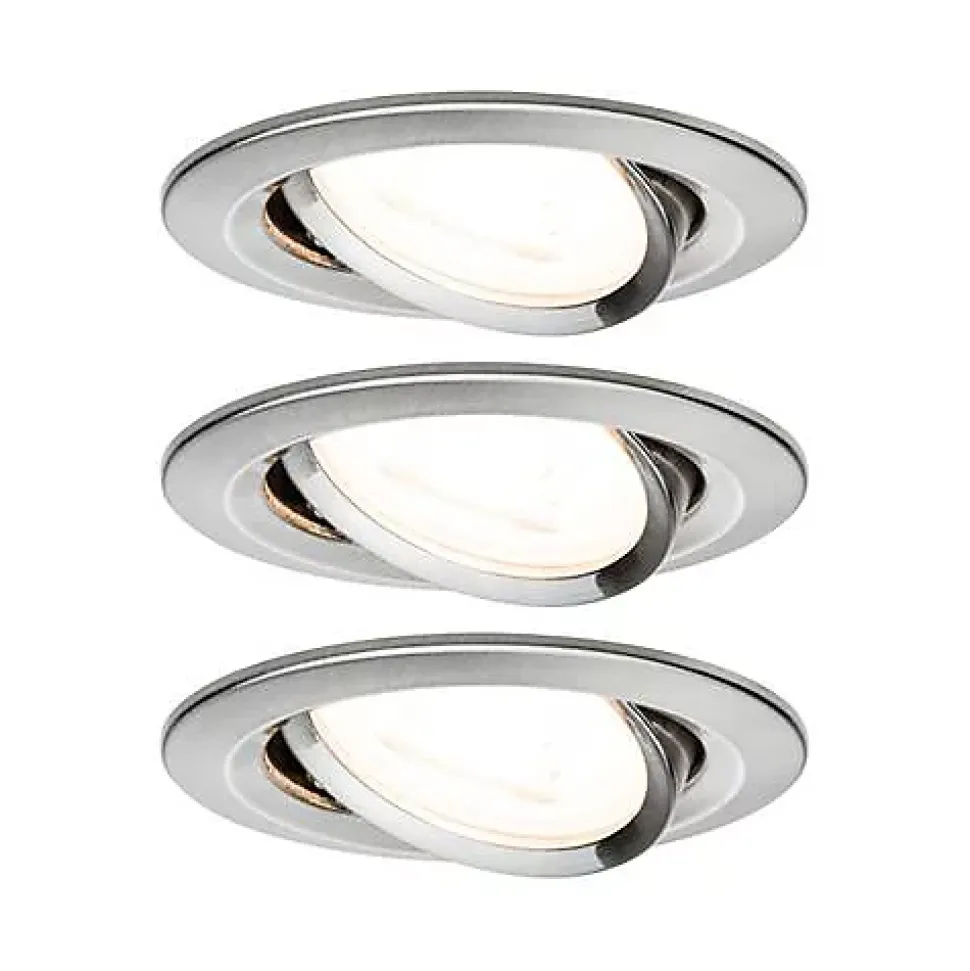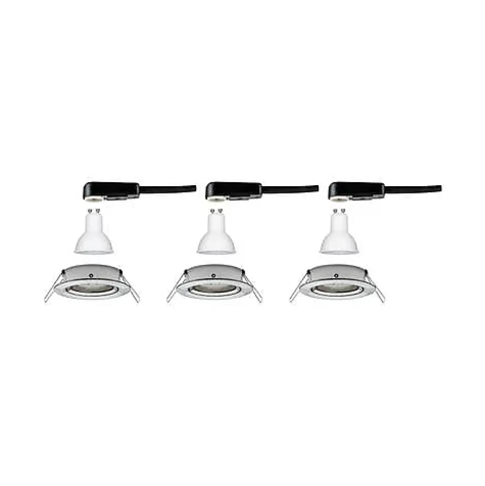 Pack de 3 spots encastrables Nova de Paulmann, avec ampoules LED GU10 incluses, finition fer brossé, orientation inclinable 50° et installation simple par ressorts. Offre une lumière blanc chaud 2700 K, flux 460 lm par source, connexion directe 230 V et design discret pour un éclairage d’accent ou général en intérieur.