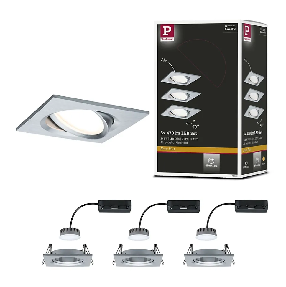 Les spots encastrés Nova Plus carrés en (kit de 3) en Alu tourné avec LED-Coin remplaçable, conviennent aussi bien à l’équipement de nouvelles installations qu’au remplacement d’équipements existants. De forme particulièrement plate, ils s’intègrent dans les plafonds disposant d’un espace creux de 30 mm seulement. Grâce à un raccordement par clips de fixation rapides, les luminaires individuels sont simples et rapides à monter. Leur variateur d’intensité permet un ajustement individuel de la luminosité offrant deux effets majeurs : vous jouissez d’une lumière de travail blanc chaud tout en baignant dans une ambiance cocooning. Grâce à sa capacité de pivotement, le spot peut être orienté individuellement.