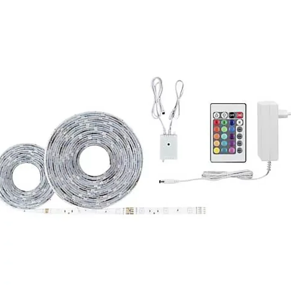 Ruban LED Paulmann SimpLED 78979, kit complet RVB de 7,5 m et 26 W, prêt à l’emploi avec alimentation 230/12V, câble et prise secteur. Télécommande incluse pour régler couleurs et effets lumineux. Ruban flexible à dos autocollant pour un montage simple sur surfaces planes ou courbes, coupable aux repères pour ajuster la longueur. Revêtement protecteur contre la poussière et les éclaboussures, adapté à une utilisation près des éviers. Flux lumineux total 760 lm, indice de rendu des couleurs 80 Ra, tension de fonctionnement 12 V, indice de protection IP20. Matériaux : métal et plastique. Non extensible, non compatible avec les bandes YourLED et MaxLED. Contenu du pack : set complet bandeau LED, alimentation et notice d’utilisation.