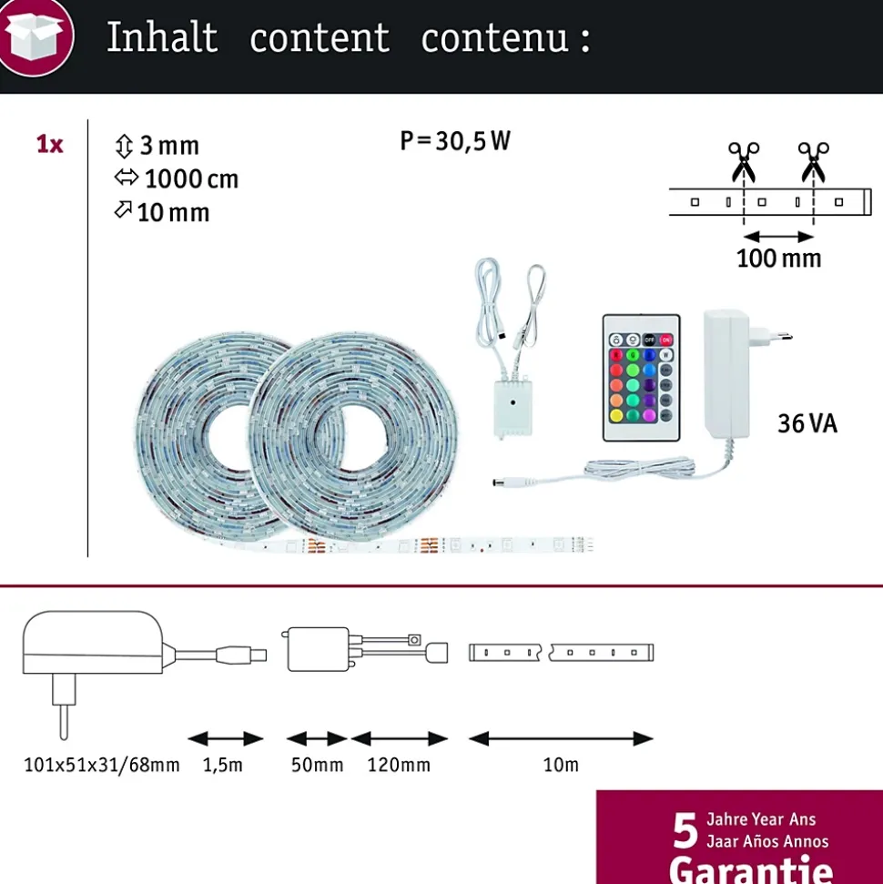 Ruban LED Paulmann SimpLED 78980, kit complet prêt à l’emploi pour l’éclairage intérieur. Longueur 10 m, puissance 28 W, tension 12 V, flux lumineux total 1010 lm, 101 lm/m, couleur d’éclairage RVB. Le kit comprend le ruban avec connecteur mâle, une alimentation 230/12 V avec câble et prise secteur, et une télécommande pour régler les couleurs et les effets. Le ruban est flexible, autocollant au dos pour un montage facile sur surfaces plates ou voûtées, et réductible aux points de coupe indiqués. Le revêtement protège contre la poussière et les projections d’eau, ce qui permet une utilisation sans risque près d’éviers et lavabos. Indice de protection IP20, indice de rendu colorimétrique 80 Ra. Non extensible et non combinable avec les gammes YourLED et MaxLED. Poids 697 g. Contenu du pack : ruban LED complet et notice d’utilisation.