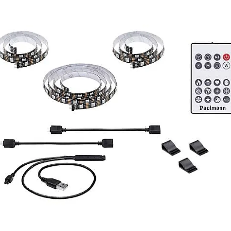 Ruban LED Paulmann TV Strips 55″ prêt à l’emploi, longueur 2 m, 60 LED/m, puissance 3 W, tension 5 V, couleur d’éclairage RVB. Conçu pour le rétroéclairage de téléviseurs 55 pouces, il se branche sur un port USB et offre des effets lumineux dynamiques grâce à sa télécommande infrarouge. Fonction dimmable et mémoire du dernier niveau d’éclairage. Matériau plastique, largeur 10 mm, hauteur 2 mm, poids 134 g. Non compatible avec les bandes YourLED et MaxLED, alimentation via USB, utilisation intérieure.