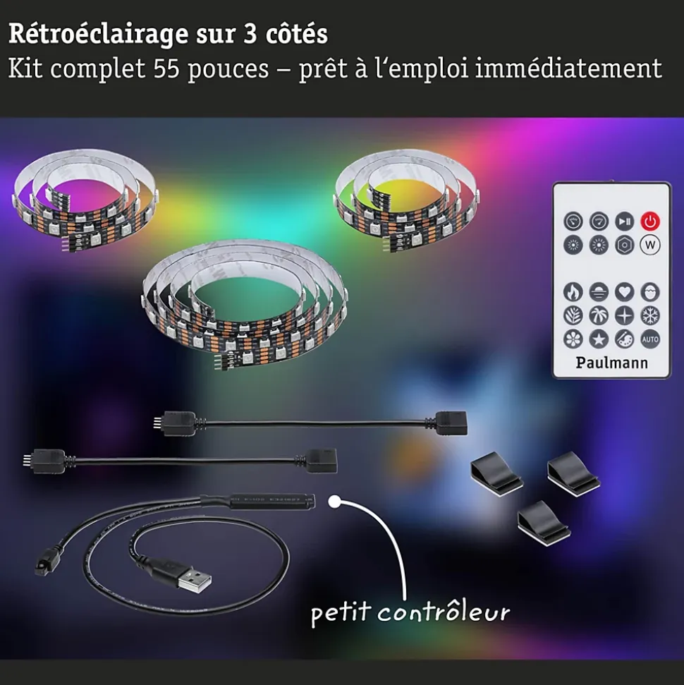Rendez votre salon plus immersif avec ce ruban LED Paulmann conçu pour téléviseurs 55″. Installation plug-and-play sur USB, couleurs RVB variées, télécommande pour un contrôle simple et fonction mémoire pour retrouver vos réglages. Faible consommation et profil discret pour un rétroéclairage élégant et pratique.
