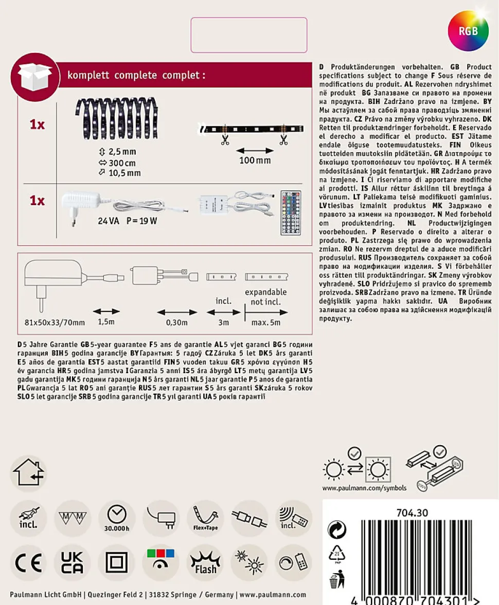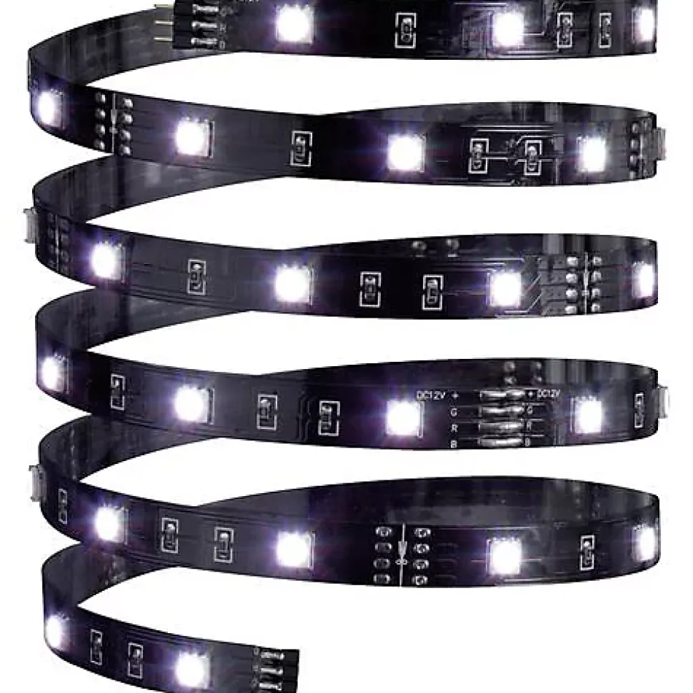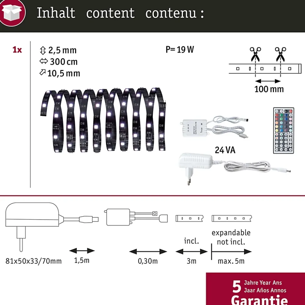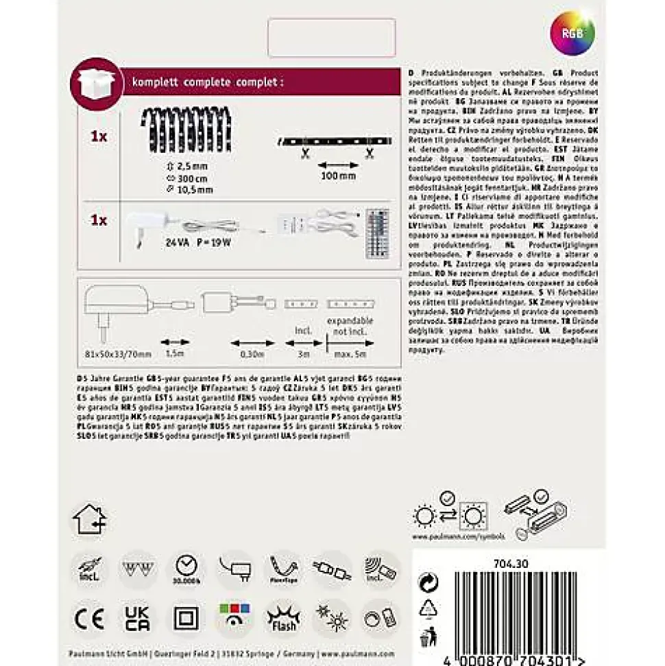 Ruban LED Paulmann YourLED ECO 70430, longueur 3 m, fonctionnement 12 V, puissance 24 W, flux lumineux total 630 lm et 90 LED. Couleur d’éclairage RGB avec variations réglables, dimmable, flexible, autocollant, raccourcissable et rallongeable. Contenu de livraison : ballast, ruban RGB ECO 3 m, contrôleur RGB avec télécommande et notice de montage. Usage intérieur, classe de protection III, matériau plastique. Remarque : pilote LED adapté à commander séparément.