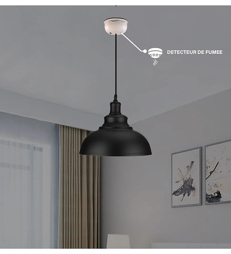 Faites le choix de l’innovation avec ce détecteur de fumée 2 en 1 qui fait aussi office de socle luminaireDESCRIPTIF :- Type de produit : pavillon détecteur de fumée- Matériau : Polycarbonate- Finition : blanc- Usage : IntérieurCARACTERISTIQUES TECHNIQUES : – Dimensions : H : 6 cm – Ø : 12 cm- Courant de fonctionne ment interne : 20m. Amp- Sensibilité de fumée : 0,65-1,52% par mètre d’obscurcissement- Humidité ambiante : 10% à 90%- Puissance sonore : 85 décibels à 3 mètres- Type de montage : Mural ou plafonnier- Indicateur d’alarme visuelle : Oui- Mode silence : Oui- Alimentation : pile lithium intégrée- Autonomie : 10 ans- Certification : CE EN 14604 BSICE QUE NOUS AIMONS :Ce détecteur de fumée d’un tout nouveau genre fait également office de socle pour vos luminaires en suspension.Au design sobre et élégant, ce détecteur sera s’intégrer dans tous les intérieurs. Le pavillon détecteur dispose d’un indicateur visuelle d’alarme et d’une fonction ?silence ? en cas de déclenchement intempestif.Pour une sécurité optimale le mode silence sera désactivé en cas de fumée épaisse.Le détecteur de fumée est un produit innovant combinant parfaitement sécurité et décoration.