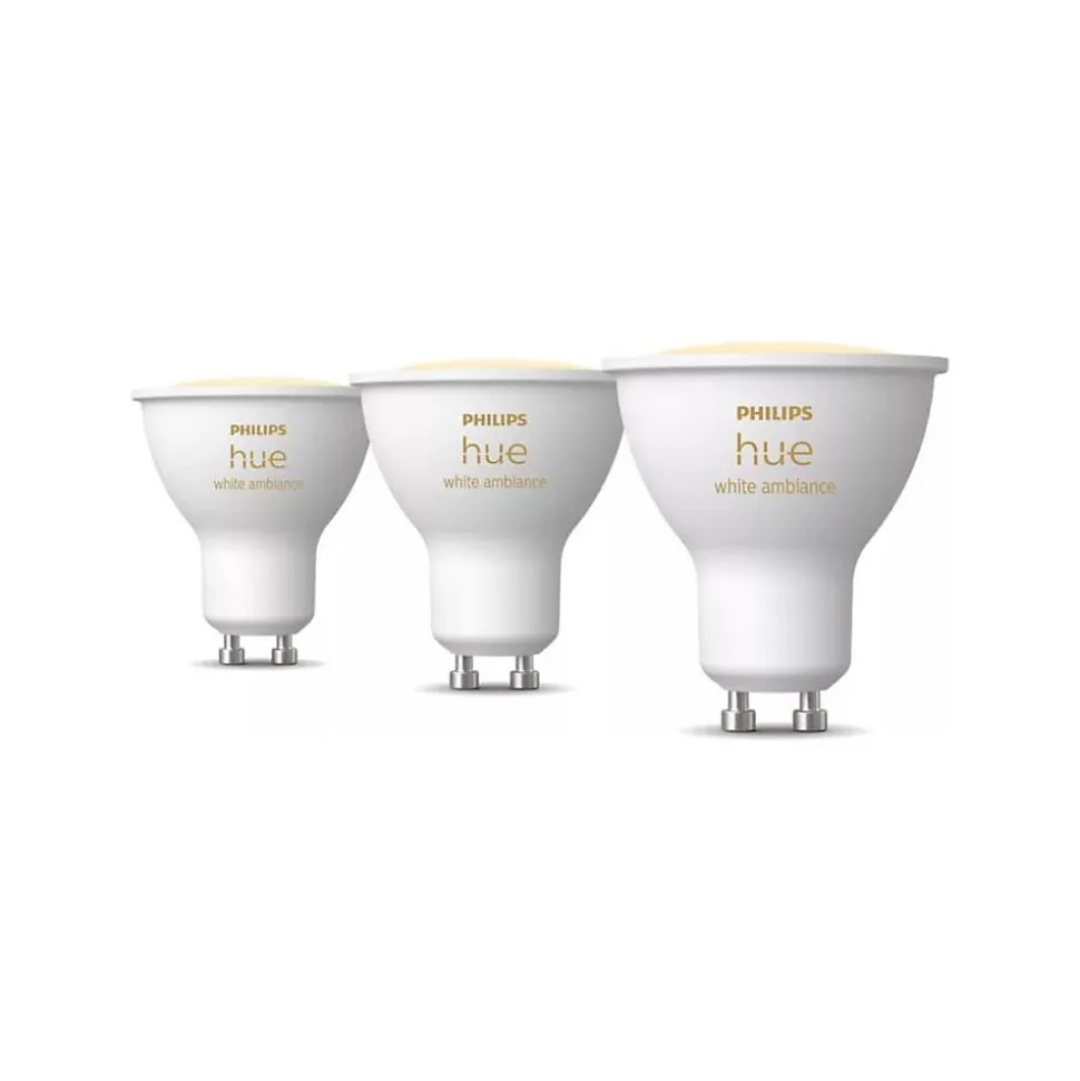 Pack de 3 ampoules Philips Hue White Ambiance GU10 : 400 lm chacune, blanc chaud à froid réglable, dimmable, connectivité Bluetooth et compatible avec Alexa, Google Assistant et Apple HomeKit. Durée de vie estimée 25 000 h, démarrage instantané, consommation 12,6 W.