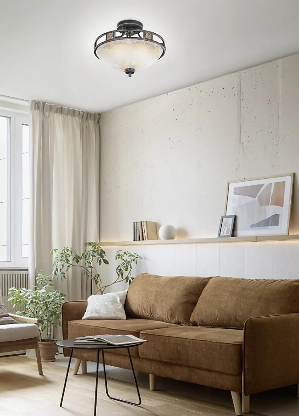 Le plafonnier Quinta : charme arts déco et ambiance chaleureuseLe plafonnier Quinta de TRIO séduit par son style authentique et son design inspiré des maîtres verriers de l’école de Nancy. Avec son cadre en métal finition rouille agrémenté d’ornements dorés, il apporte une touche de caractère à vos intérieurs rustiques ou méditerranéens. Son diamètre de 42 cm et sa hauteur de 32 cm en font un choix idéal pour habiller joliment vos pièces de vie.Une lumière douce et accueillanteDoté d’un diffuseur en verre albâtre légèrement texturé, ce plafonnier diffuse une lumière chaleureuse et tamisée, parfaite pour créer une ambiance conviviale et reposante dans votre salon, salle à manger ou entrée. Compatible avec 3 ampoules E27 (jusqu’à 60W chacune), il permet de personnaliser l’intensité lumineuse selon vos envies.Compatibilité avec les ampoules LEDPour un éclairage écoénergétique, il est conseillé d’opter pour des ampoules LED. Elles offrent jusqu’à 80 % d’économies d’énergie par rapport aux lampes halogènes classiques, tout en garantissant une excellente qualité de lumière, une longue durée de vie et une faible émission de chaleur. Une solution durable qui respecte aussi l’environnement.Caractéristiques supplémentairesMontage facile au plafondIndice de protection IP20 : pour un usage en intérieurTension : 230V ~ 50HzClasse de protection : IDimensions : Ø 42 cm, hauteur 32 cmApportez du charme et du caractère à votre intérieur avec le plafonnier Quinta : une pièce décorative qui allie authenticité, chaleur et qualité.