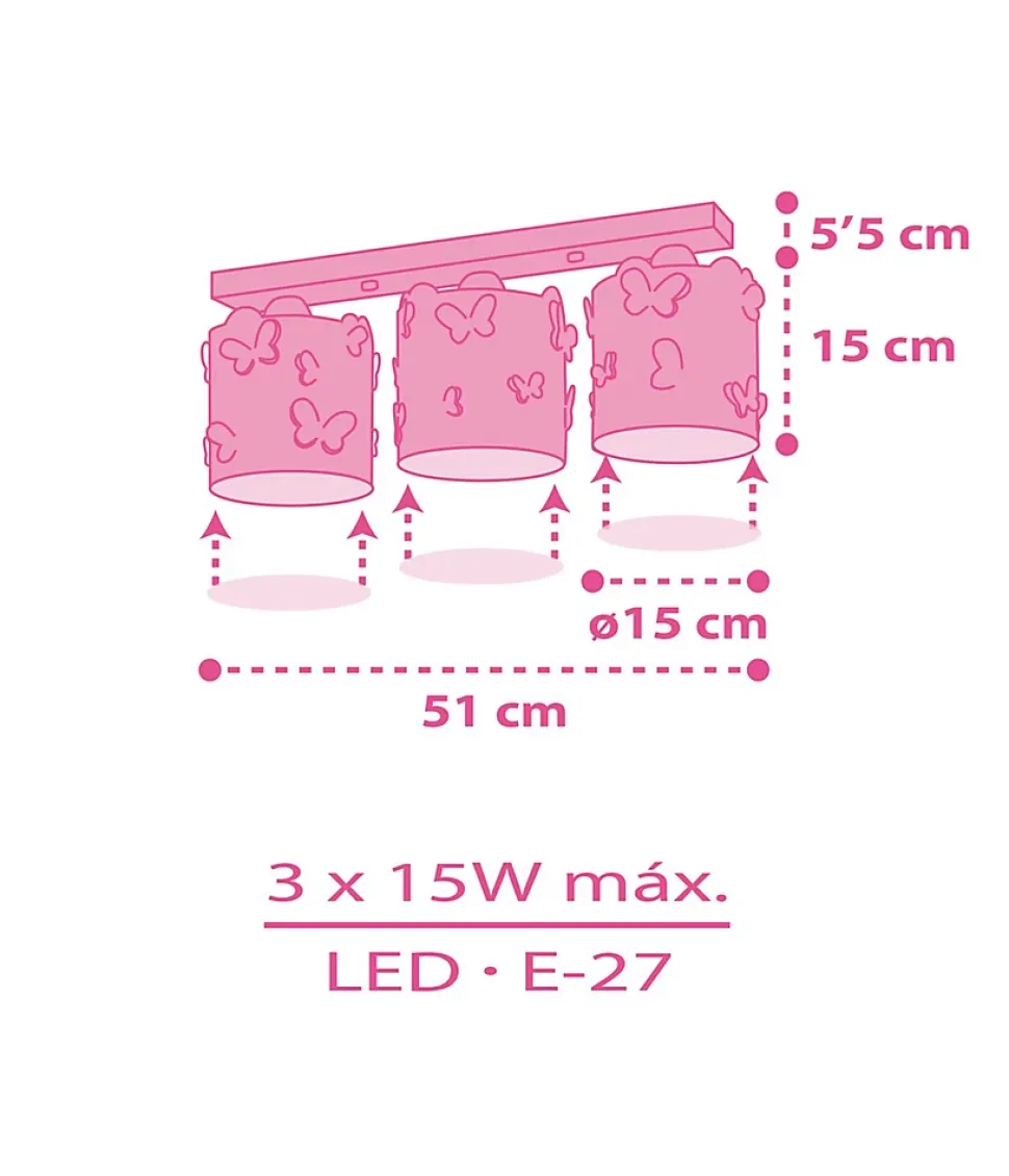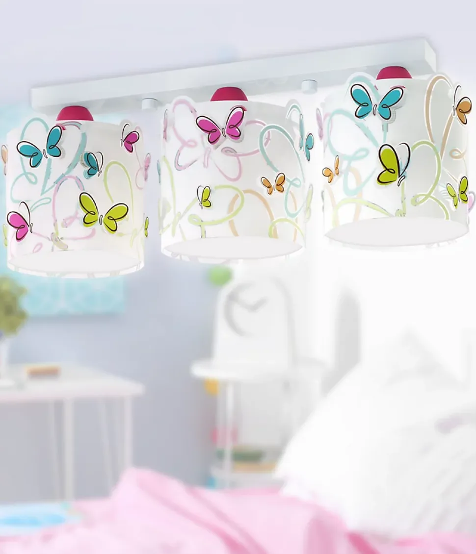 Plafonnier chambre bébé avec papillons ButterflyLe plafonnier chambre bébé Butterfly apportera à la chambre des enfants des papillons multicolores amusants qui, en plus d’éclairer, ajouteront une touche de couleur unique. Avec le reste des lampes de la collection, vous créerez un ensemble original et le meilleur éclairage.Plafonnier pour bebe: caractéristiques Les plafonniers pour enfants sont installées directement au plafond. De cette façon, vous obtiendrez une lumière générale bien répartie dans toute la pièce, en évitant les ombres ou les zones moins éclairées. Grâce aux trois ampoules qu’il utilise, vous obtiendrez une lumière puissante parfaite lorsque vous aurez besoin d’un éclairage supplémentaire. Il est fait de polypropylène transparent.
