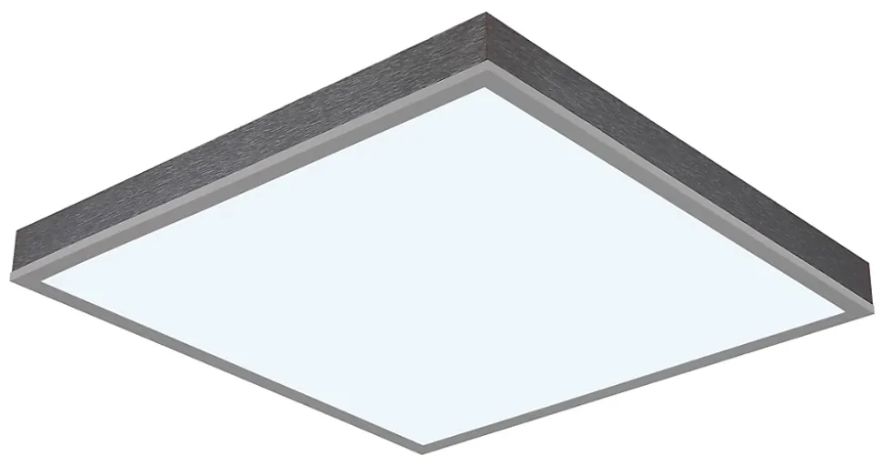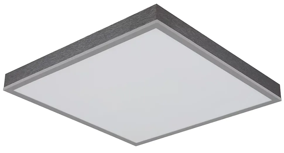 Plafonnier aluminium couleur argent, MDF gris foncé, plastique opale, Dimmable, Plusieurs intensités à gérer par un interrupteur mural, couleur fixe, Fonction de mémoire, Veilleuse, Timer, Télécommande, Batterie incluse 2x AAA, LxPxH: 450x450x75mm, incl. LED 24W 230V, 250-2500lm Source, 160-1600lm Output, CCT 2700-6500K