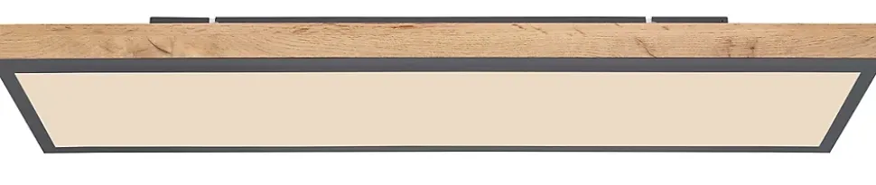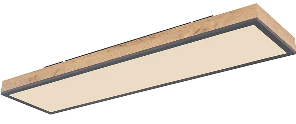 Plafonnier aluminium graphite, MDF décor bois, Acrylique opale, Dimmable, Plusieurs intensités à gérer par un interrupteur mural, couleur fixe, Fonction de mémoire, Veilleuse, Timer, Télécommande, Batterie incluse 2x AAA, LxPxH: 800x200x78mm, incl. LED 24W 230V, 100-2500lm Source, 60-1500lm Output, CCT 3000-6500K
