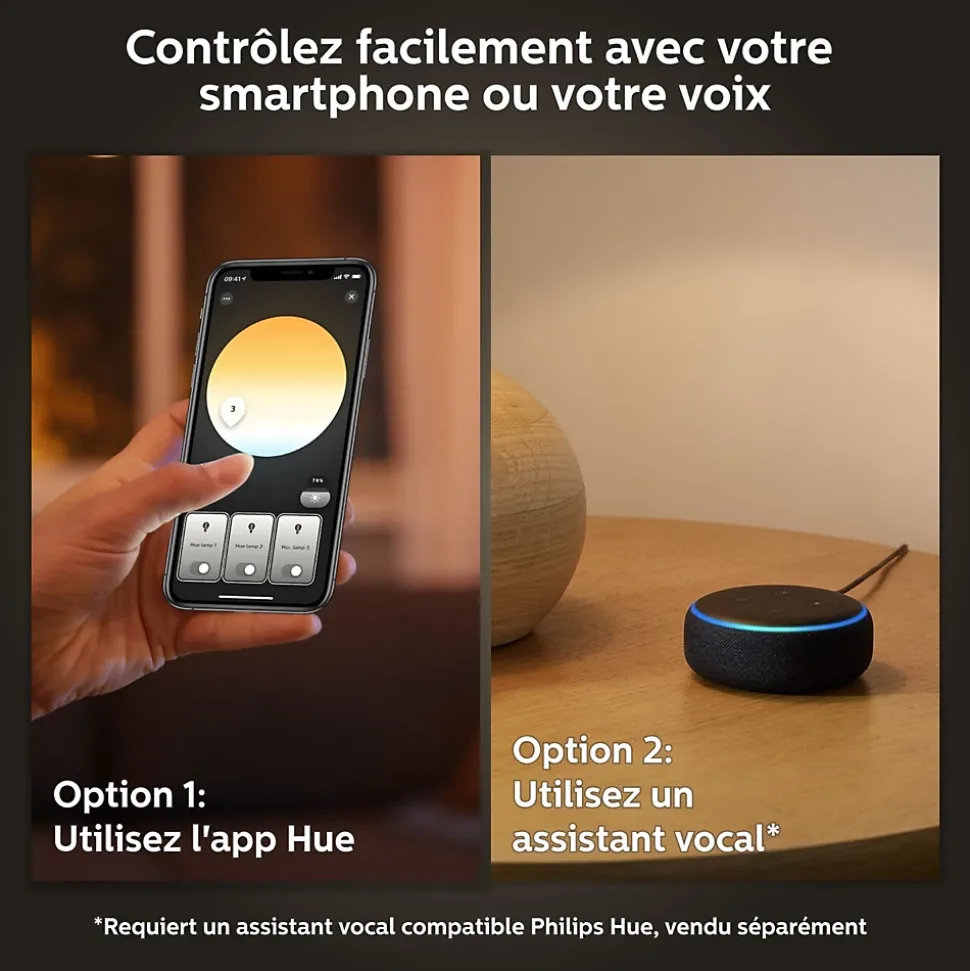 - En plus de son design élégant, avec ce luminaire télécommandable Philips Hue, vous maîtrisez l’éclairage ni trop faible, ni trop fort.
