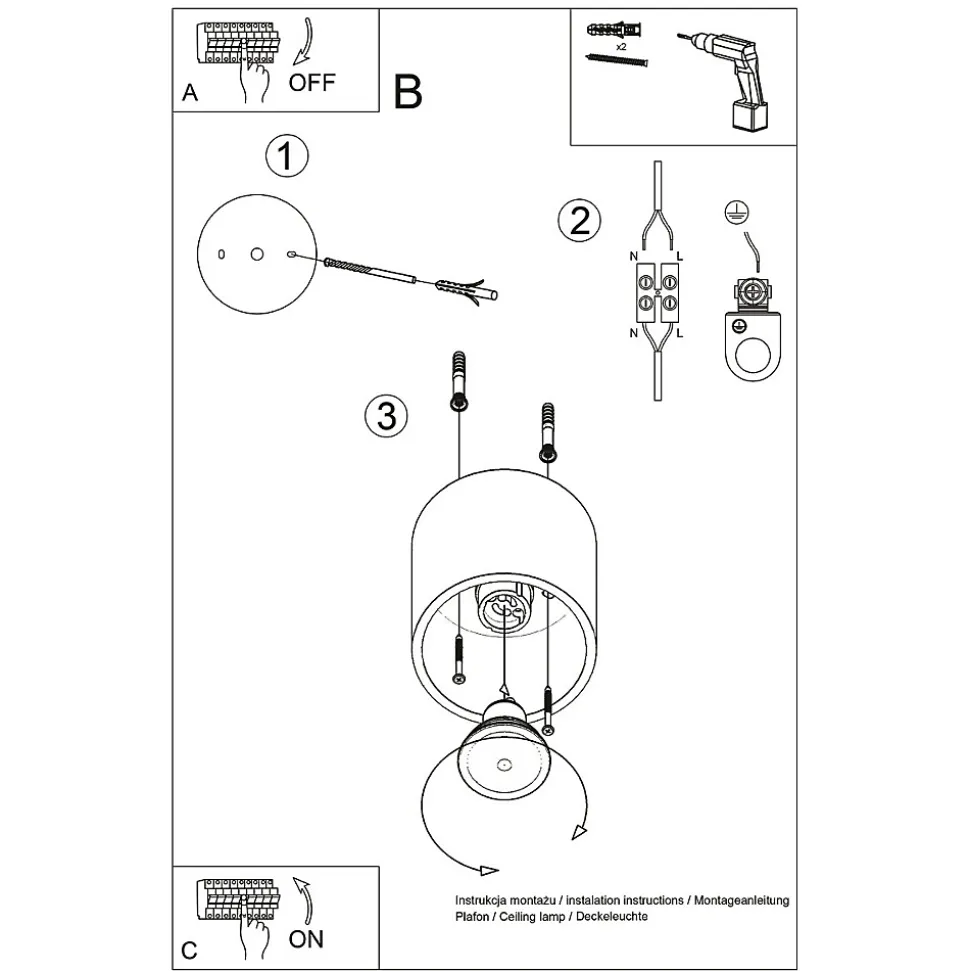 - Source lumineuse : GU10, 1x LED max 10W, ~230V, 50Hz, IP20, classe de protection I.