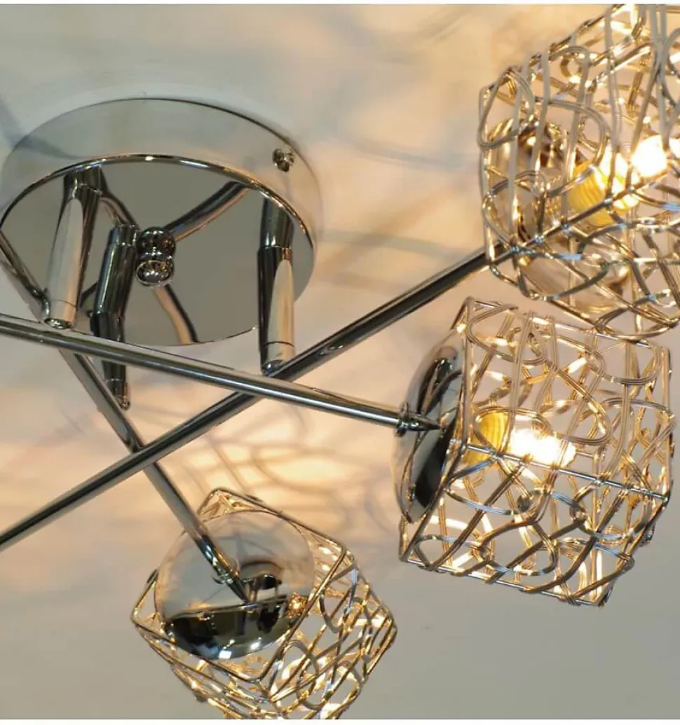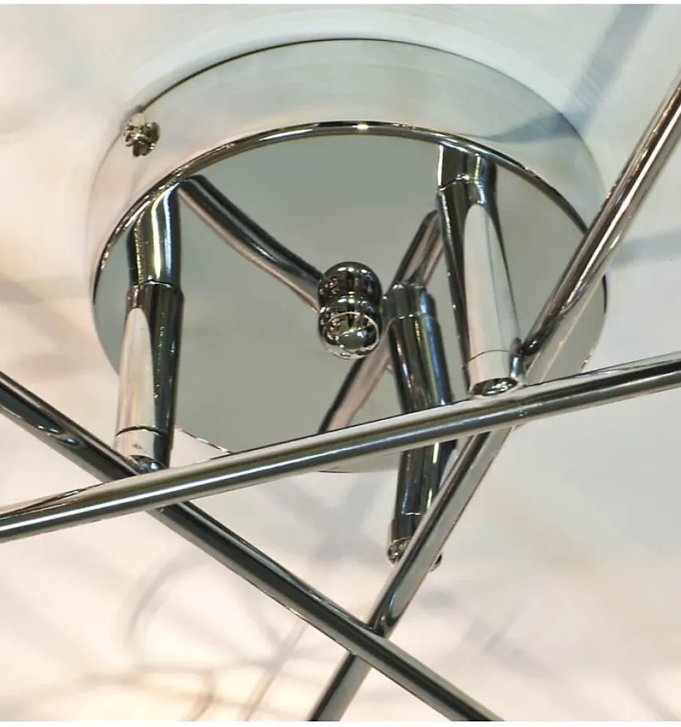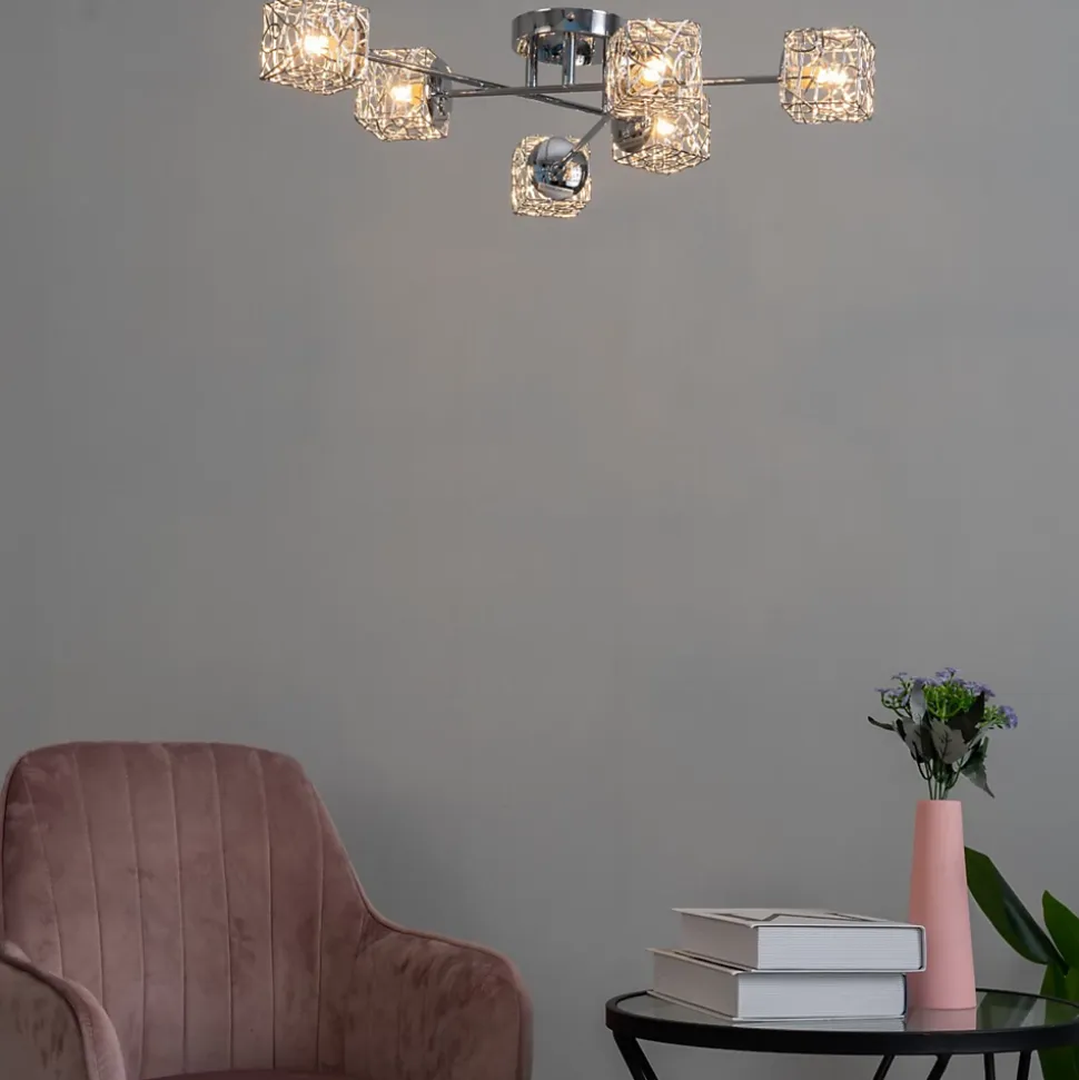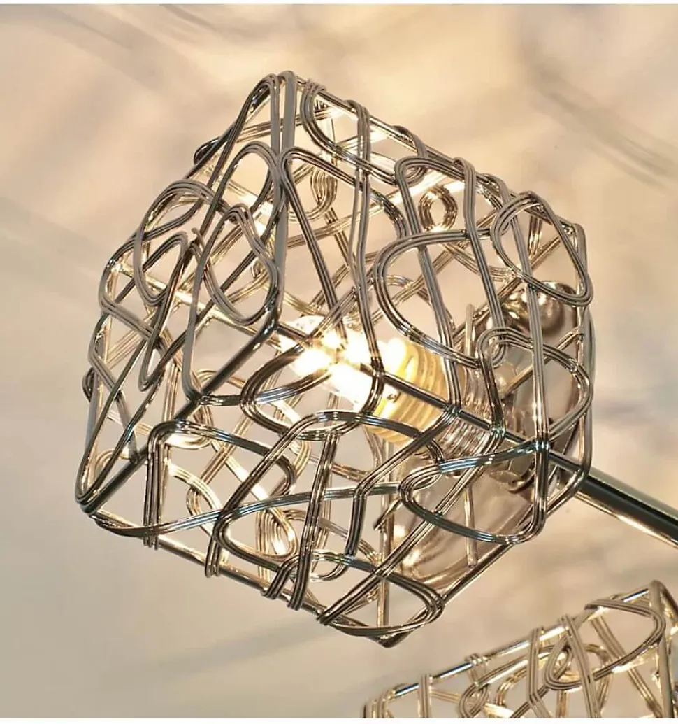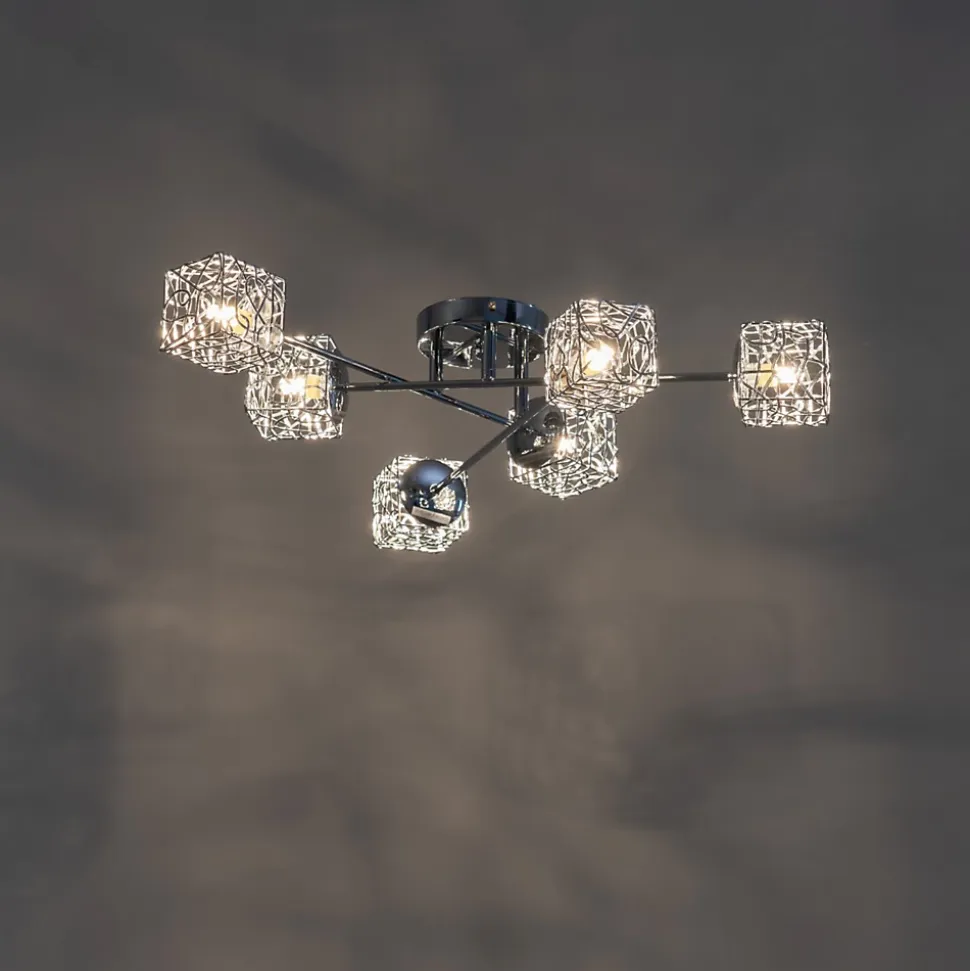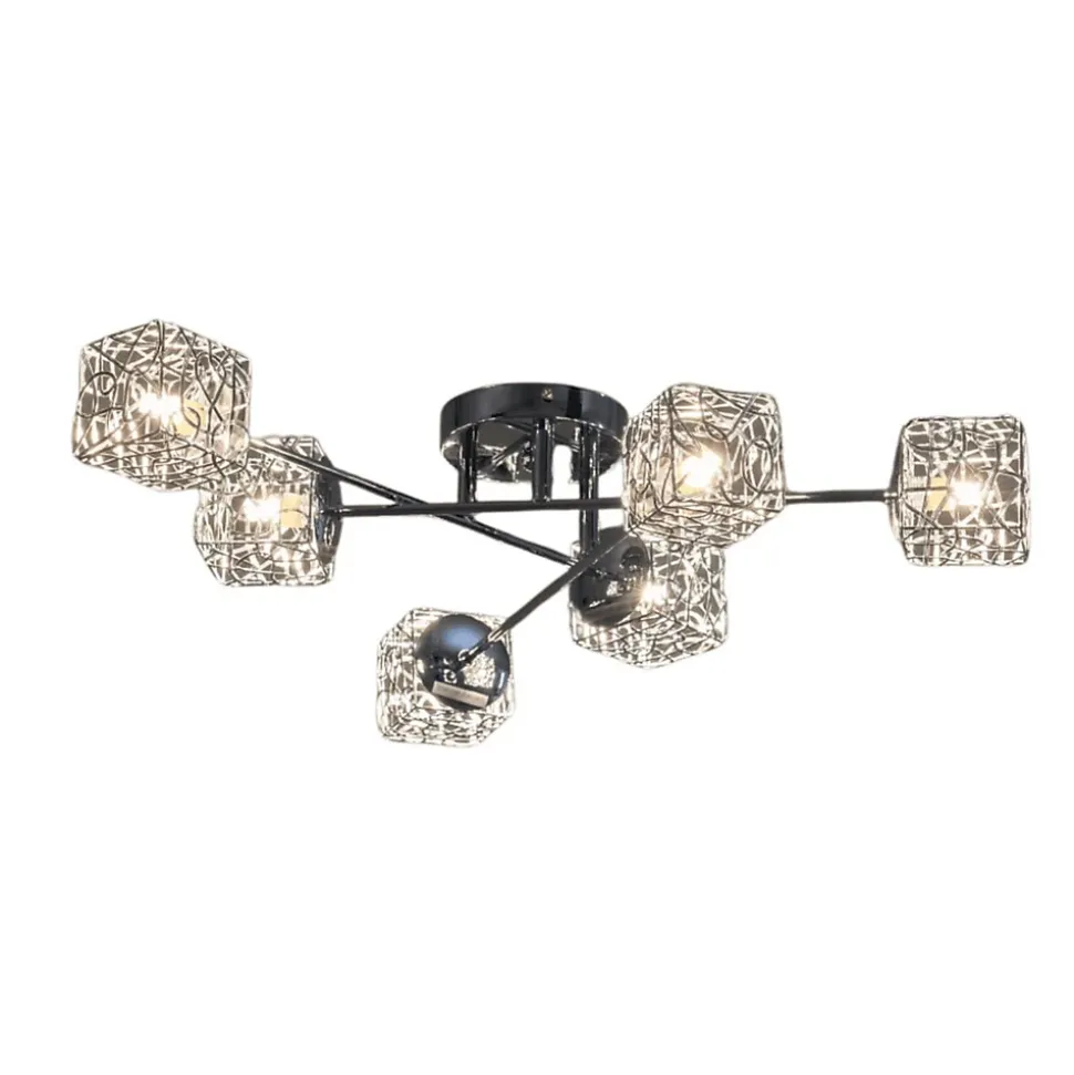 Plafonnier très design Aphyse fabriqué en métal chromé et en aluminium. Le luminaire est composé de 6 branches entremêlées au bout desquels se trouvent des cubes dessinés avec des motifs en aluminium. L’éclairage s’effectuera par 6 ampoules de culot G9 (non fournies) , qui permettront un rendu homogène sur tout l’espace.Existe aussi en 8 branches.) Assemblage simple requis (
